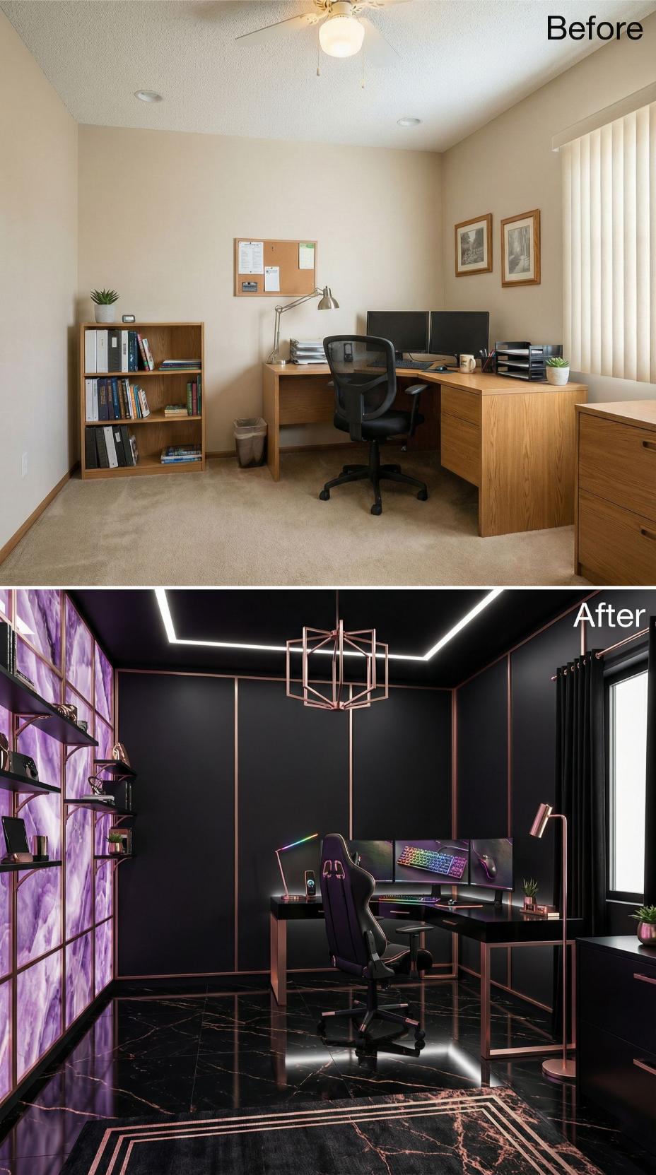 Dark charcoal walls and copper geometric trim elevate this workspace from bland beige mediocrity into a striking gaming sanctuary. Purple crystal shelving displays treasured collections while LED strip lighting creates an atmospheric glow around the perimeter. The sleek glass desk anchors multiple monitors, transforming mundane productivity into an immersive digital experience that commands attention and reflects serious gaming prowess.