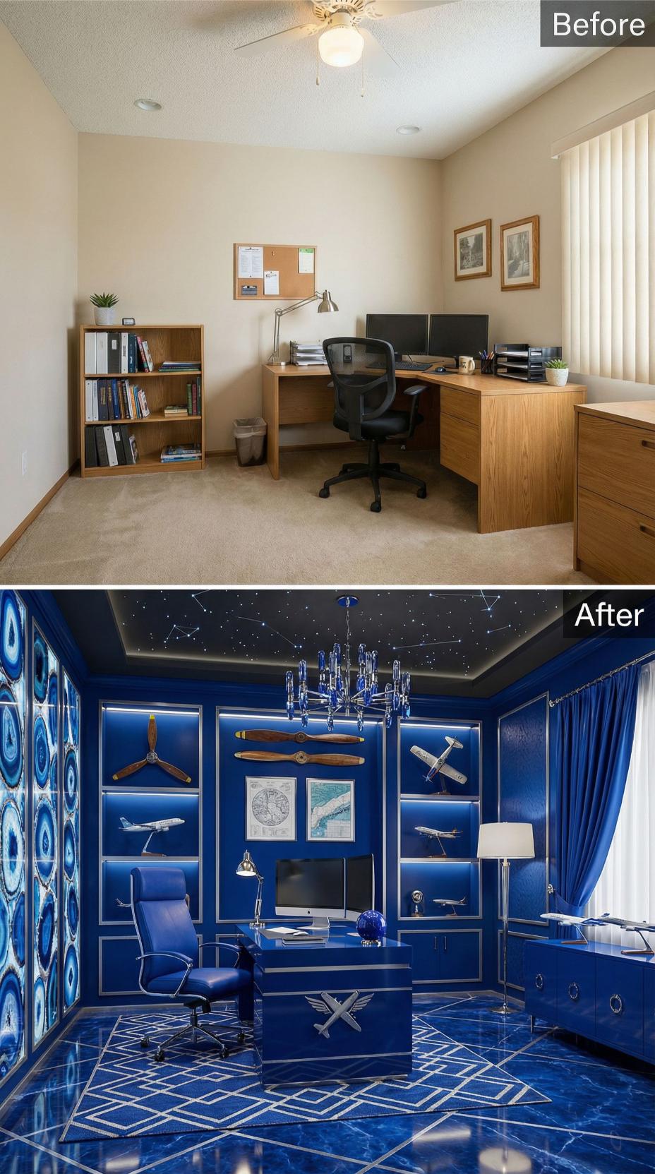 Bold royal blue transforms this mundane builder grade home office into a sophisticated aviation-themed sanctuary. Custom built-ins showcase vintage propellers and aircraft models, while luxurious velvet curtains and a crystal chandelier elevate the spaceโs drama. The geometric ceiling treatment and glossy marble-look flooring create an executive atmosphere that commands attention and respect.