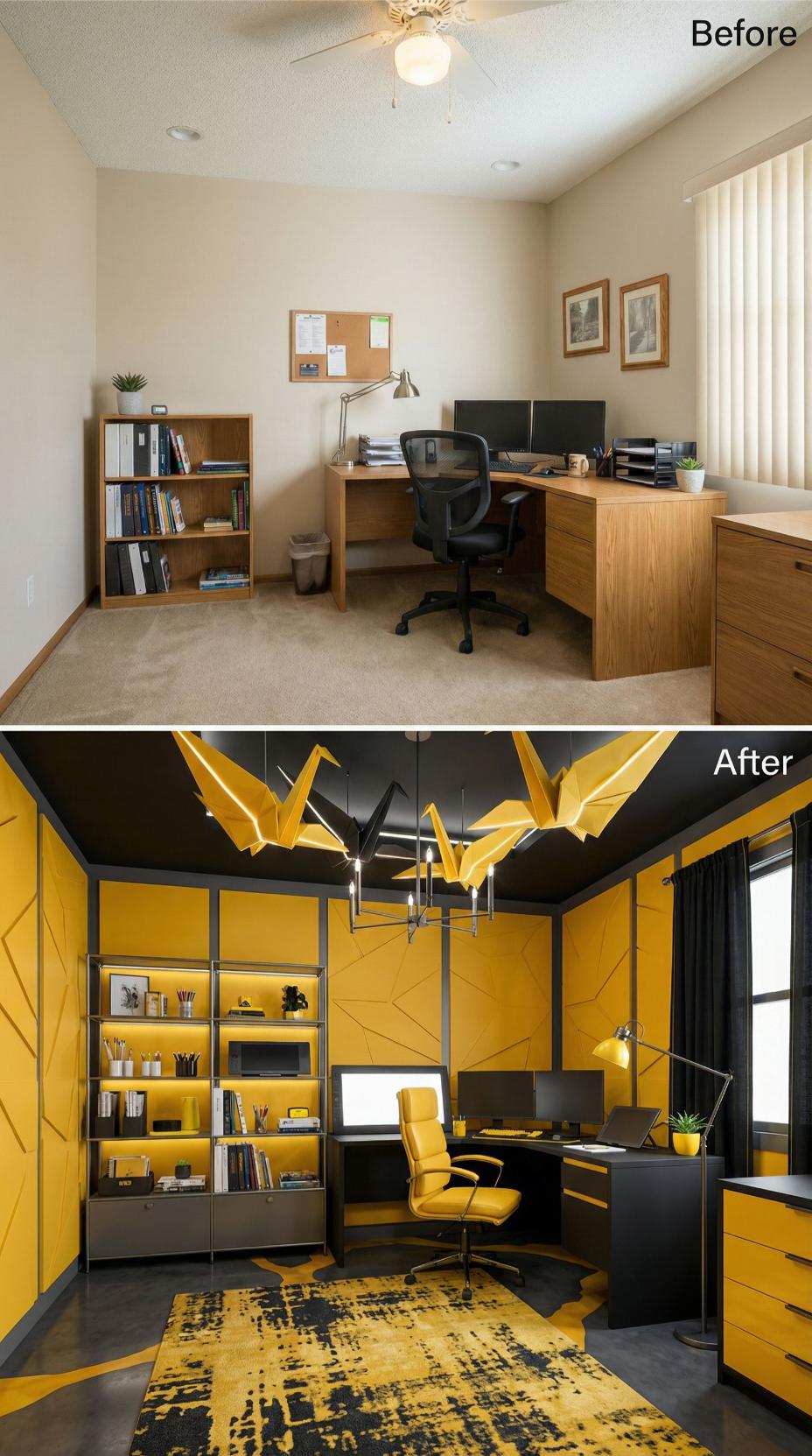 Dramatic yellow cabinetry transforms this once-generic builder grade home office into a commanding workspace worthy of executive attention. Black ceiling paint and oversized origami crane sculptures create theatrical contrast against the vibrant geometric wall panels. Custom built-ins replace basic wood furniture while a luxurious yellow leather chair anchors the corner desk setup. Industrial-style lighting and a bold patterned rug complete this unapologetically confident design transformation.