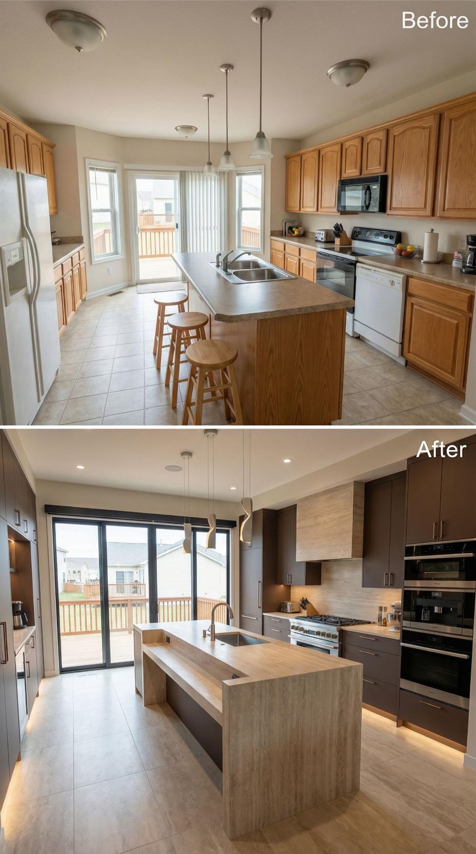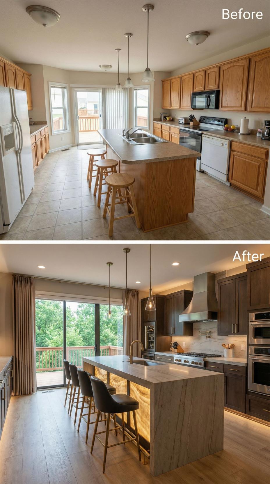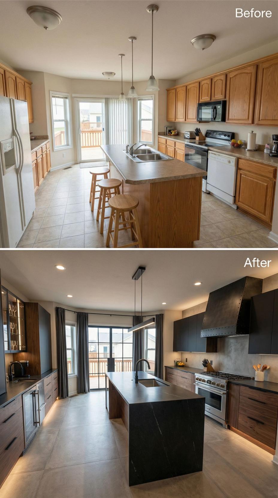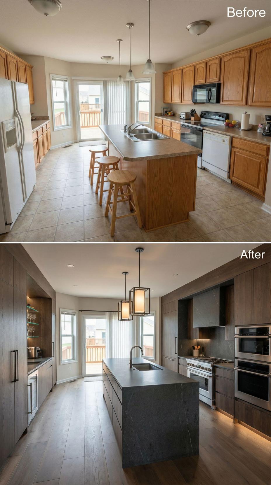 Rich walnut cabinetry transforms this builder grade kitchen into a sophisticated culinary workspace. Sleek flat-panel doors replace traditional raised panels, while under-cabinet LED lighting creates warm ambiance throughout the space. The original tile flooring gives way to wide-plank hardwood, and modern geometric pendant lighting replaces outdated fixtures. Leather bar stools and professional-grade appliances complete this stunning metamorphosis from basic to breathtaking.