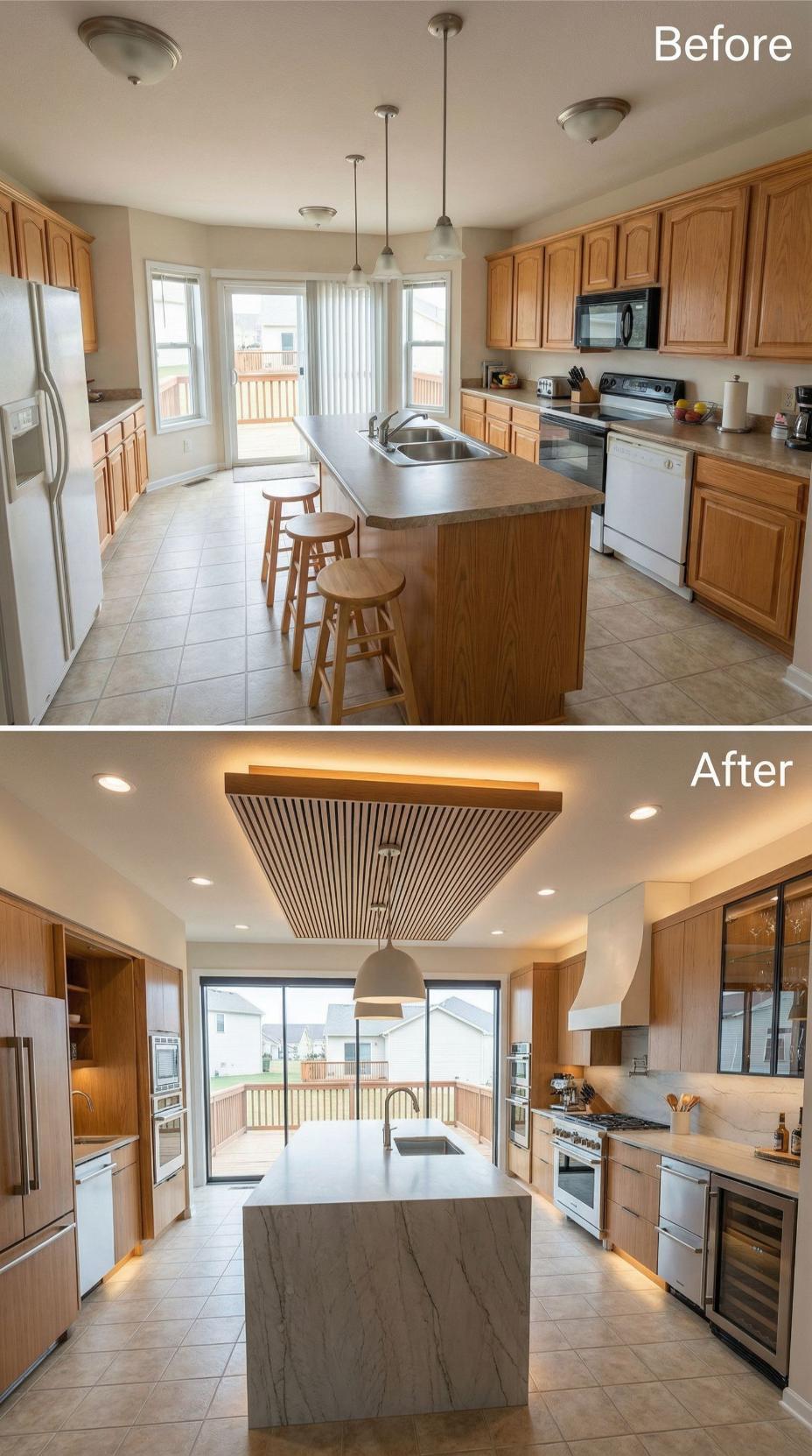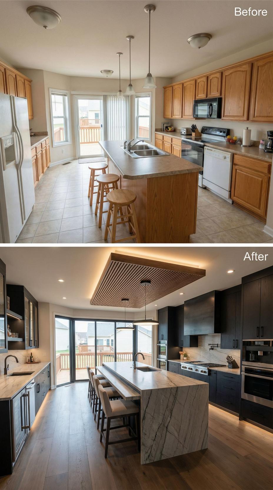 Dramatic ceiling treatment with warm wood slats transforms this builder grade kitchen into a sophisticated culinary space. Sleek flat-panel walnut cabinetry replaces dated raised-panel doors, while a stunning waterfall quartz island anchors the redesigned layout. Strategic recessed lighting and streamlined hardware elevate the entire aesthetic from basic to breathtaking.