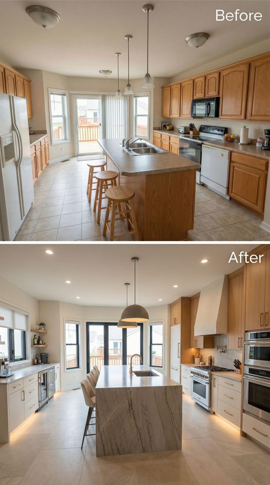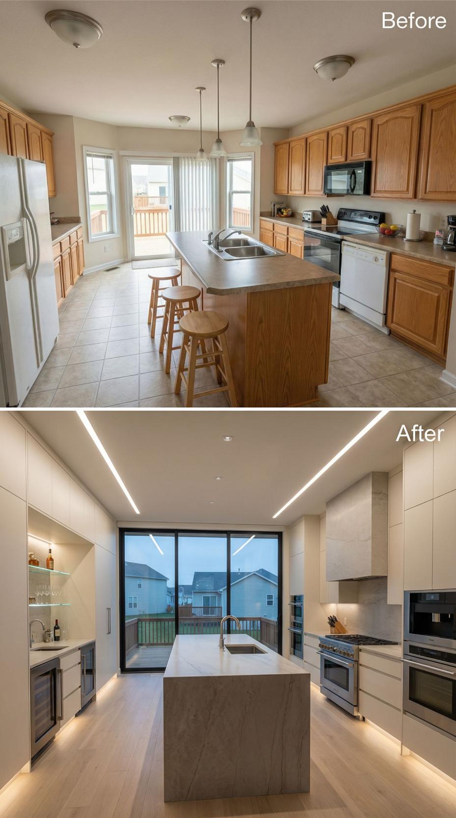 Sleek white oak cabinetry with contemporary flat-panel doors replaces outdated raised-panel cupboards in this stunning transformation. The original builder grade kitchen received a complete overhaul featuring dramatic waterfall-edge marble countertops, professional-grade stainless steel appliances, and sophisticated brass pendant lighting. Recessed ceiling lights illuminate the space while under-cabinet LED strips create warm ambient lighting throughout the reimagined culinary workspace.