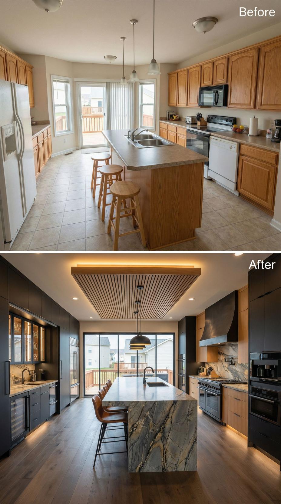 Dramatic marble veining transforms this builder grade kitchen into a sophisticated culinary showcase. Dark charcoal cabinetry replaces honey oak, while a stunning waterfall island anchors the space with luxurious stone that flows seamlessly from countertop to floor. Sleek black appliances and warm wood ceiling details create the perfect balance between industrial edge and natural warmth.