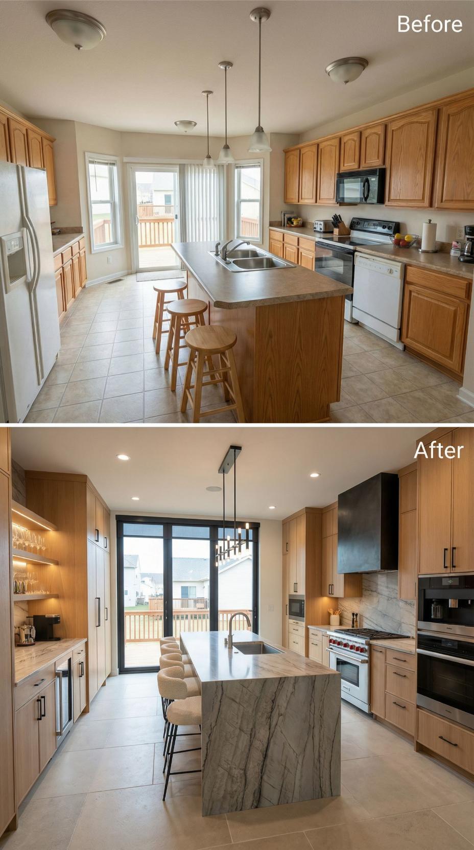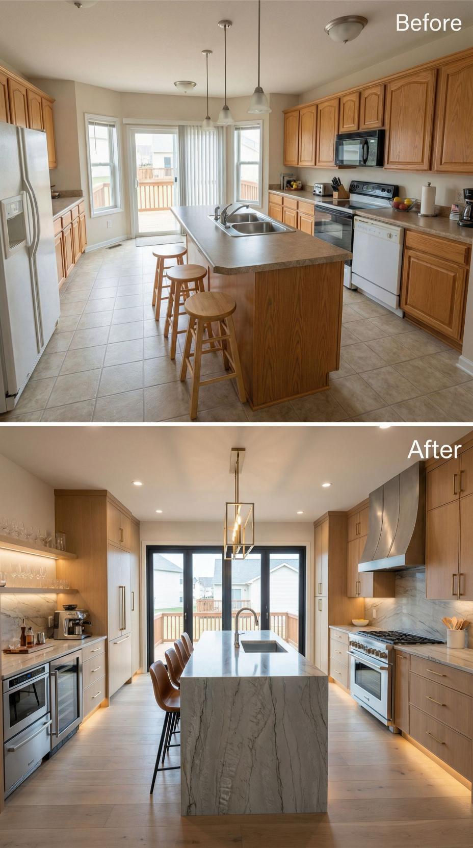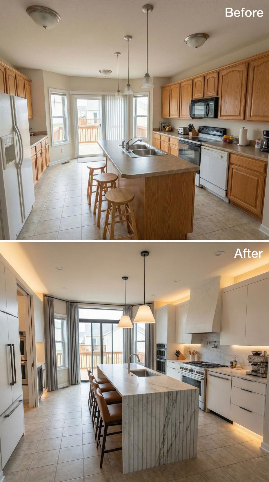 Sleek contemporary design transforms this builder grade kitchen into a sophisticated culinary workspace. Light oak flat-panel cabinets replace traditional raised doors, while dramatic veined quartz waterfall countertops anchor the enlarged island. Under-cabinet LED lighting creates warm ambiance, complemented by black-framed patio doors that flood the space with natural light and seamless outdoor connectivity.