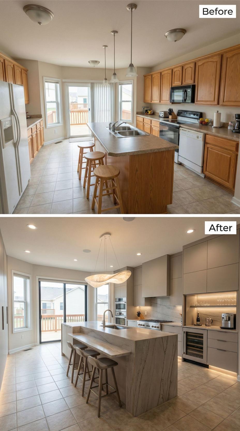 Sleek taupe flat-panel cabinetry replaces dated honey oak raised-panel doors, instantly modernizing this builder grade kitchen. The dramatic waterfall quartz island anchors the space, while integrated LED lighting and a sculptural pendant create sophisticated ambiance. Professional-grade stainless steel appliances and minimalist hardware complete the stunning transformation from cookie-cutter to custom contemporary design.