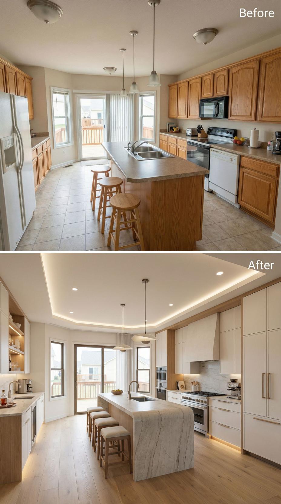 Dramatic transformation elevates this builder grade kitchen into a sophisticated culinary sanctuary. Rich wood accents now complement sleek white cabinetry with contemporary hardware, while strategic lighting creates warmth through recessed ceiling fixtures and under-cabinet illumination. Natural stone countertops replace basic surfaces, and hardwood flooring adds luxury underfoot. The redesigned space maximizes both style and functionality for modern living.