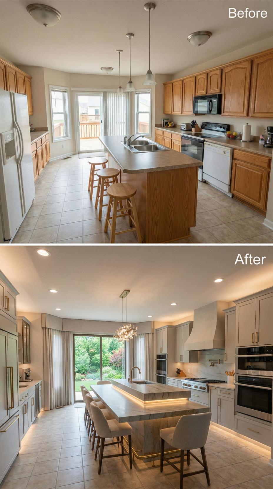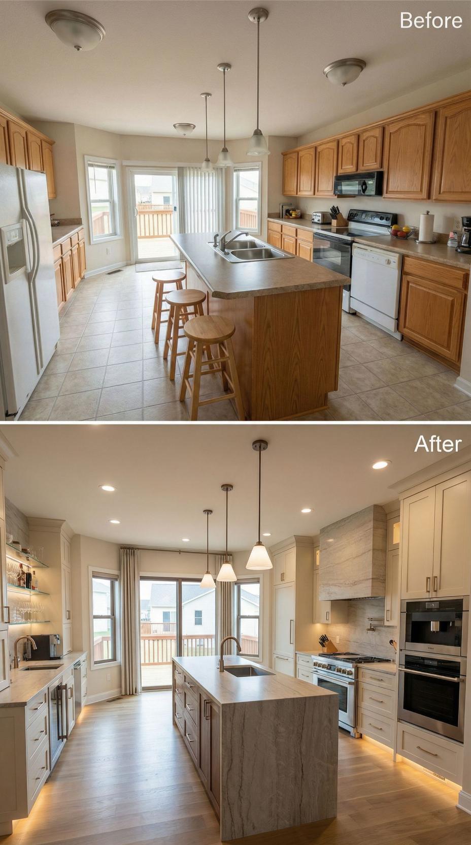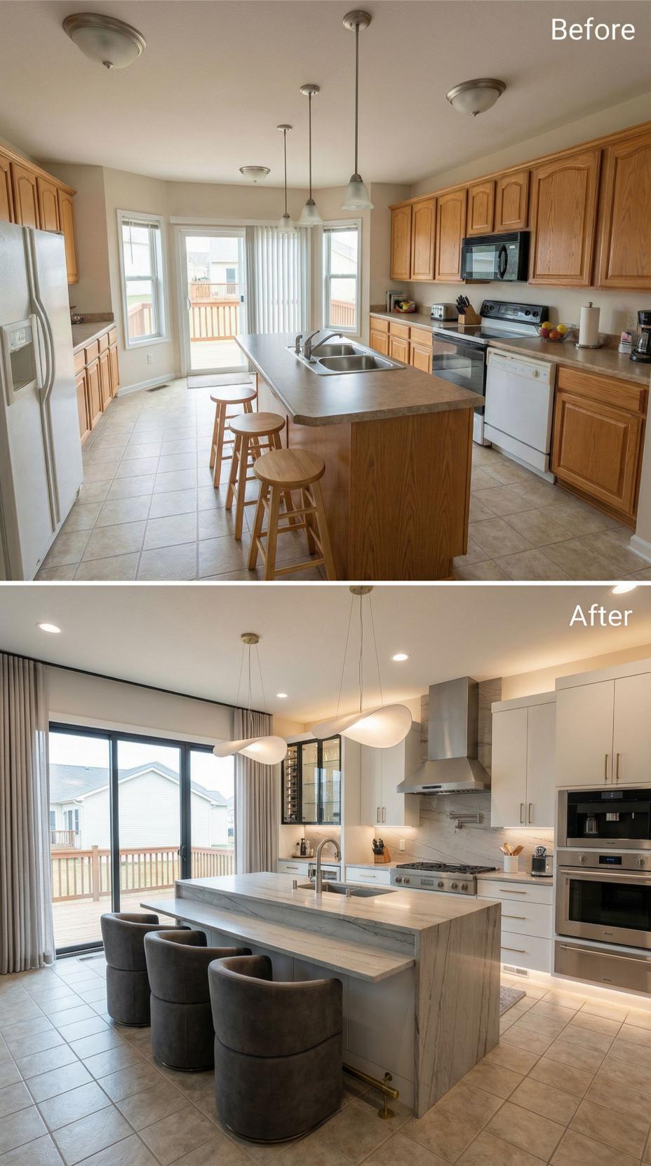 Sophisticated materials and thoughtful design choices completely transformed this basic builder grade kitchen into a stunning contemporary space. Light wood cabinetry paired with darker island tones creates beautiful contrast, while recessed lighting and elegant pendant fixtures replace outdated ceiling mounted options. Premium appliances, stone countertops, and flowing curtains elevate the entire aesthetic from standard to spectacular.
