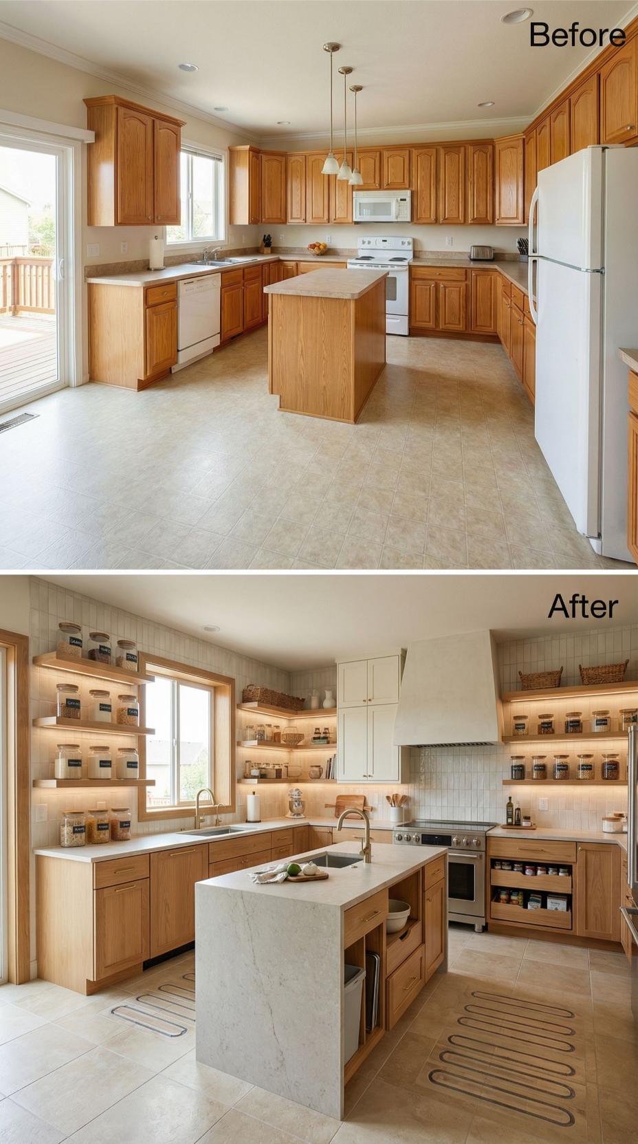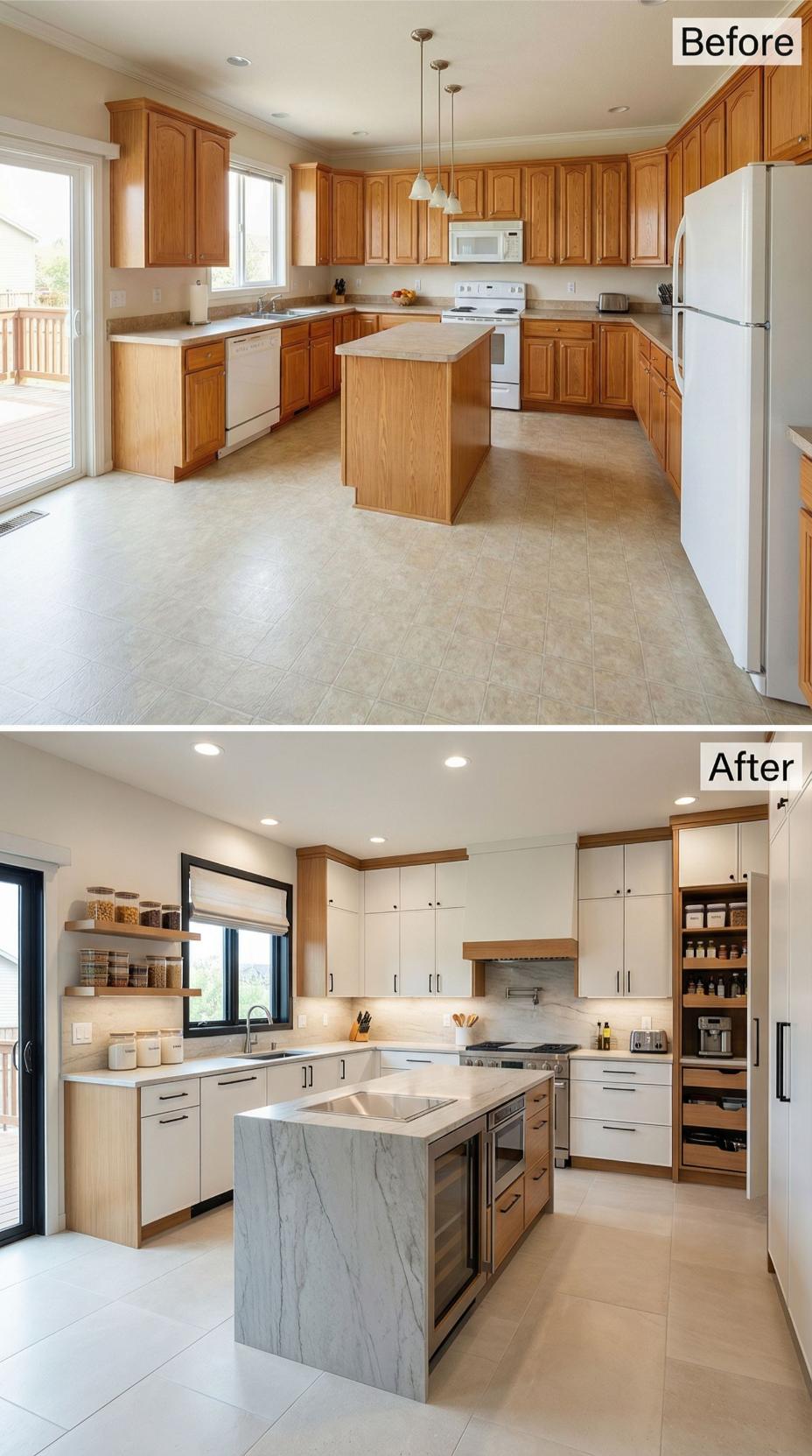 Rich honey oak cabinets and basic appliances gave way to a stunning contemporary transformation. Sleek white cabinetry, marble waterfall countertops, and warm wood shelving create perfect balance between modern functionality and organic warmth. Professional-grade stainless steel appliances, under-cabinet lighting, and a spacious island with seating elevate this space from standard builder grade kitchen to sophisticated culinary haven.