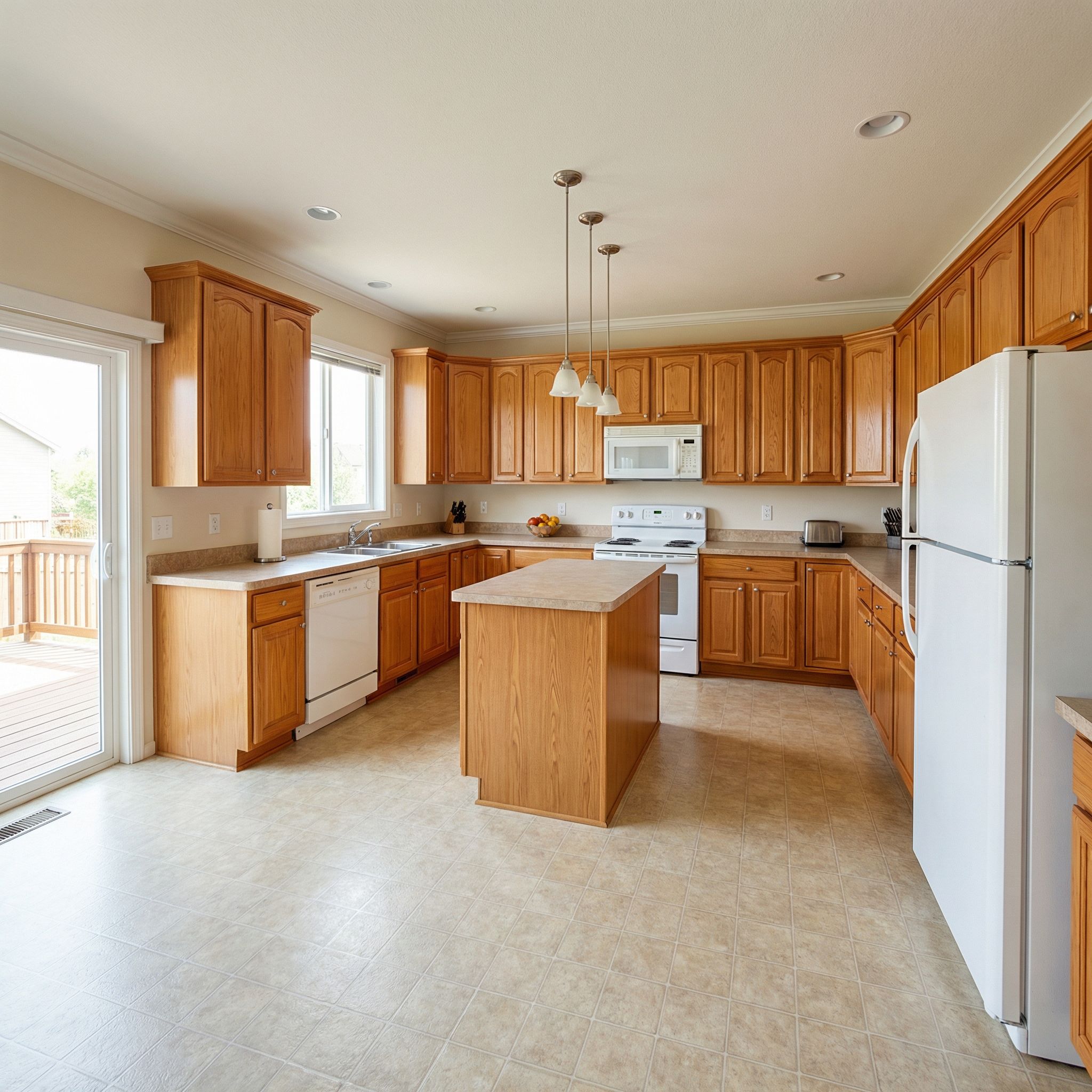 Rich honey oak cabinetry transforms this builder grade kitchen into a sophisticated culinary haven. White quartz waterfall countertops replace basic laminate surfaces, while sleek black pendant lights and under-cabinet LED strips elevate the ambiance. Stainless steel appliances integrate seamlessly with the warm wood tones, and clever pull-out drawer organizers maximize storage functionality throughout the redesigned space.