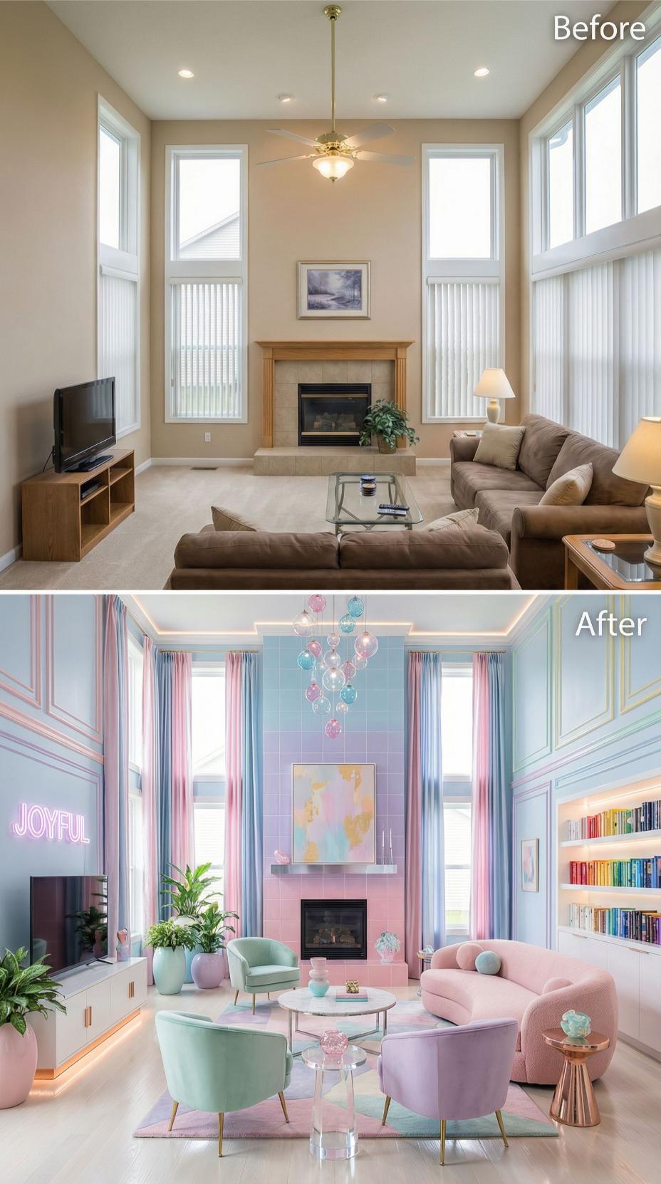 Bold pastel hues completely transformed this builder grade living room into a whimsical wonderland. Pink and mint green accent chairs arranged around a sleek white coffee table create perfect conversation zones, while colorful striped curtains replace basic blinds. The fireplace surround now features gradient pink-to-blue walls, complemented by rainbow-organized built-in bookshelves and playful bubble chandeliers that replaced standard ceiling fans.