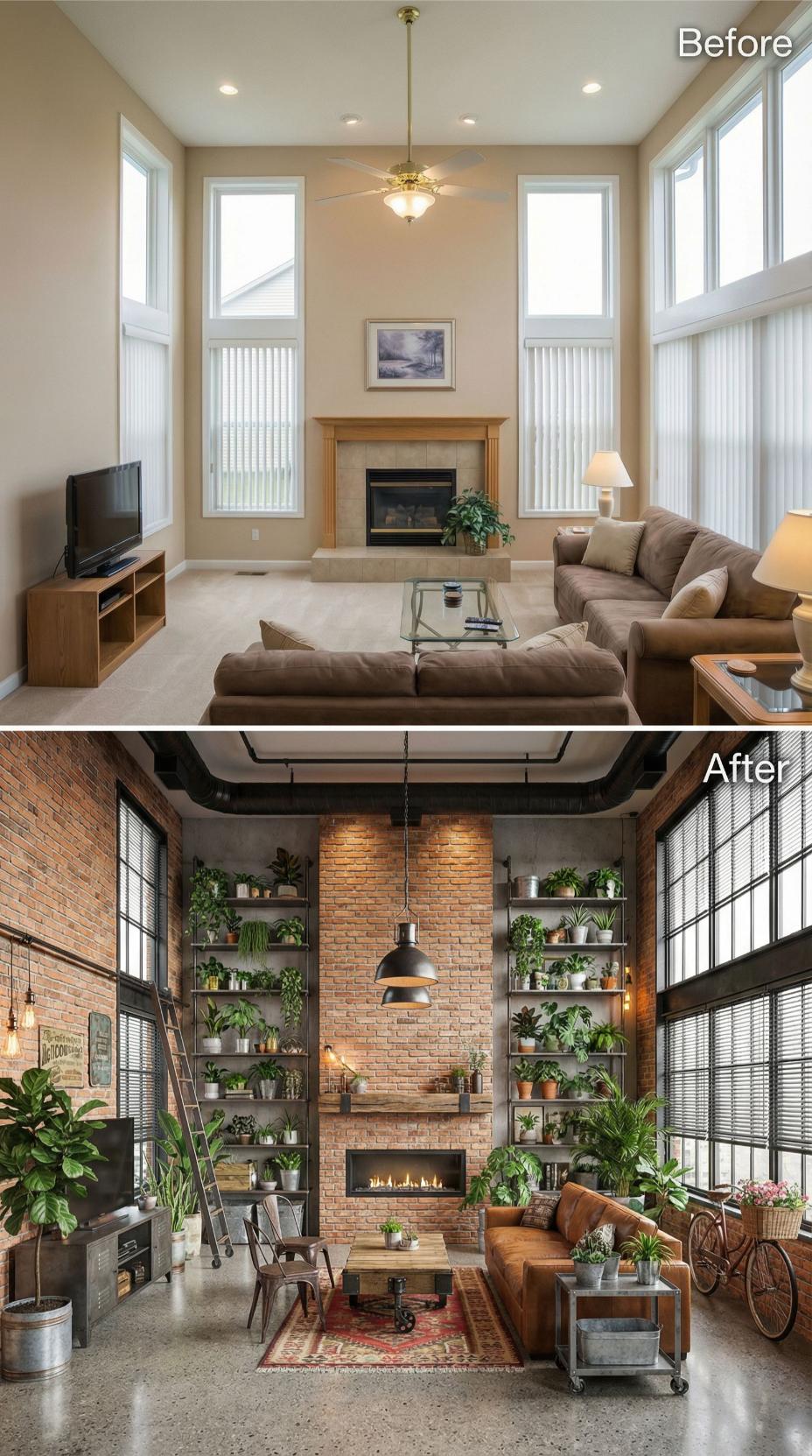 Exposed brick walls and industrial metal shelving completely reimagine this builder grade living room into an urban sanctuary. Raw materials like weathered brick and dark steel create dramatic contrast against the original neutral palette, while abundant greenery softens the industrial edge. The transformation introduces character through vintage-inspired furniture, pendant lighting, and curated plant displays that breathe life into formerly sterile space.