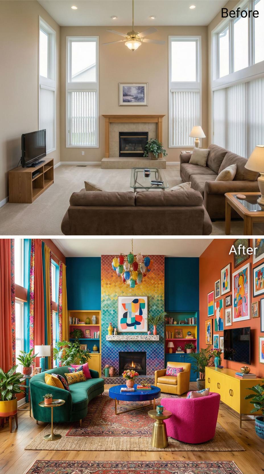 Bold jewel tones completely transformed this neutral builder grade living room into an eclectic maximalist haven. Vibrant emerald seating pairs with hot pink accent chairs, while geometric tiled fireplace surrounds anchor the dramatic makeover. Colorful striped curtains, gallery walls bursting with artwork, and layered Persian rugs create visual depth that replaces the original bland beige palette with personality-packed design.