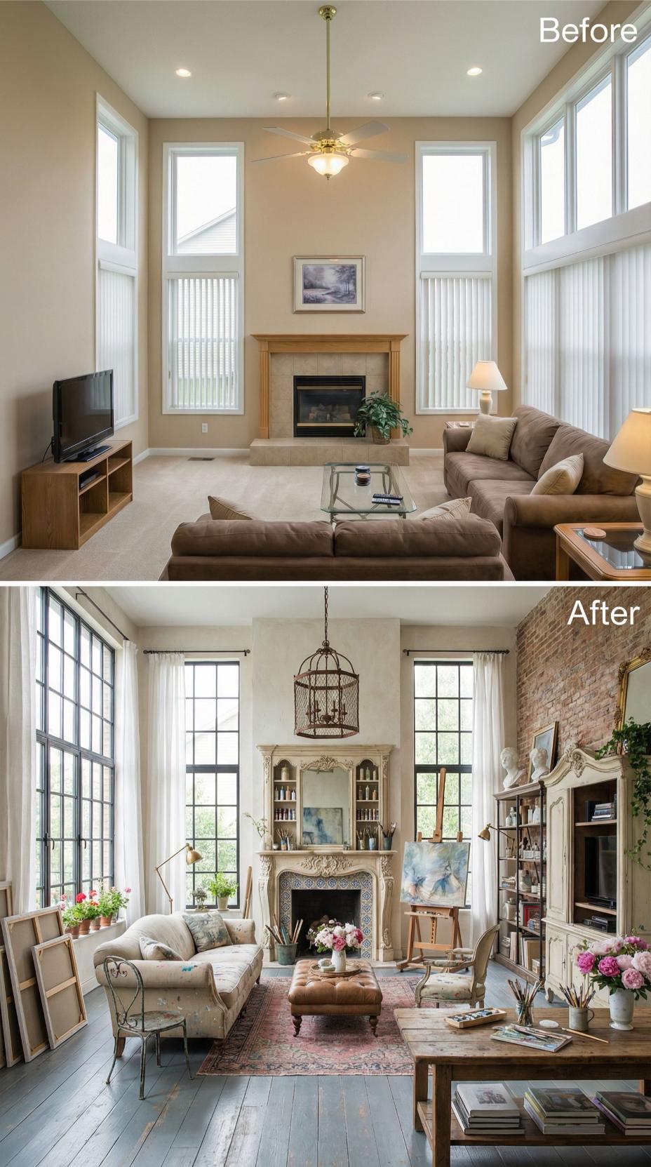 Dramatic black steel-framed windows replace basic vinyl ones, instantly elevating the builder grade living roomโs character. Rich exposed brick walls add texture and warmth, while an ornate carved limestone fireplace surround creates a stunning focal point. Vintage Persian rugs layer over dark hardwood floors, complemented by eclectic furnishings, fresh florals, and an artistโs easel that transforms this space into a sophisticated creative sanctuary.