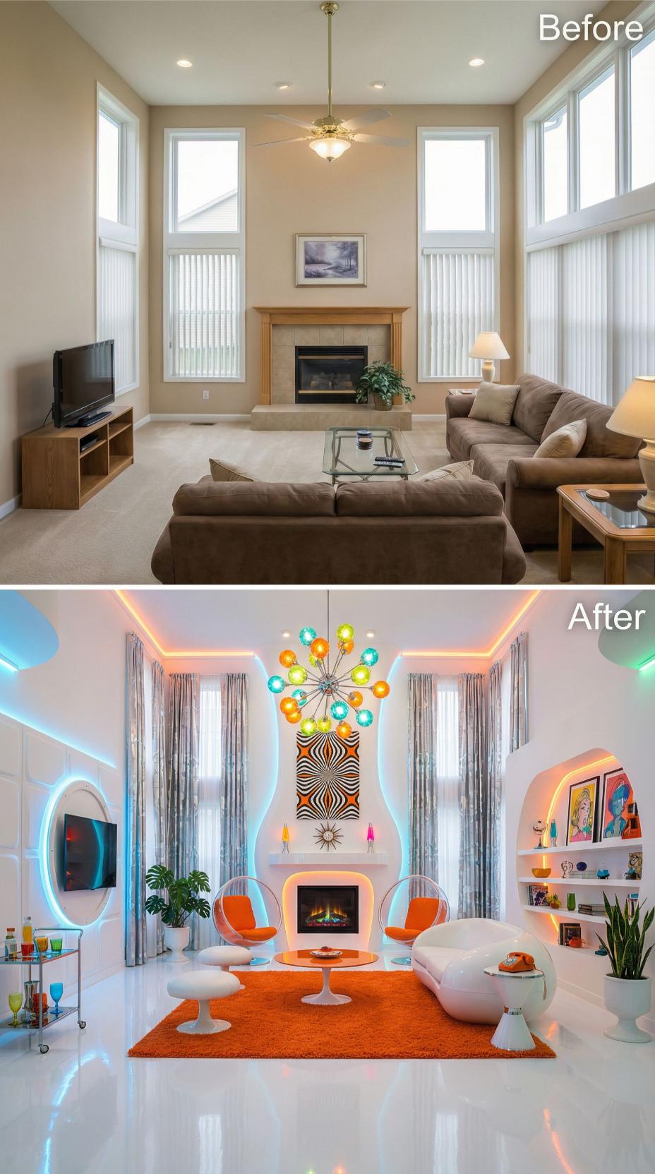 Bold orange tulip chairs and a vibrant shag rug transform this once-neutral builder grade living room into a space-age sanctuary. LED strip lighting creates dramatic ceiling coves while built-in shelving replaces basic furniture. The original fireplace gets a sleek white surround upgrade, complemented by a colorful molecular chandelier that commands attention overhead.