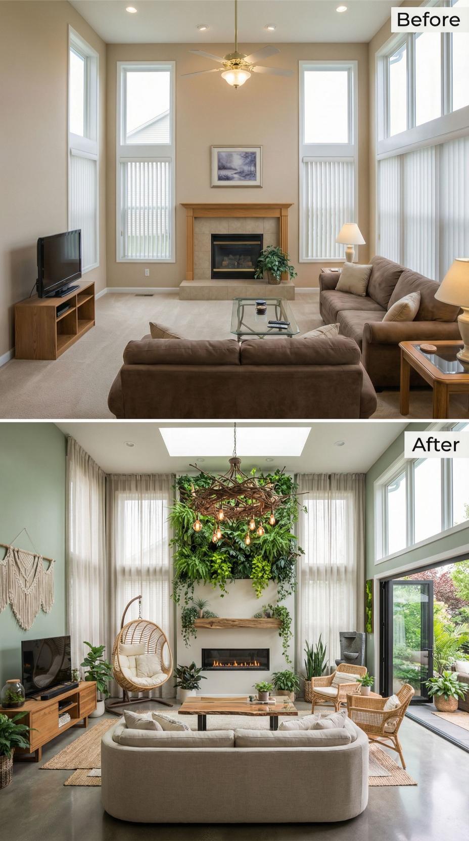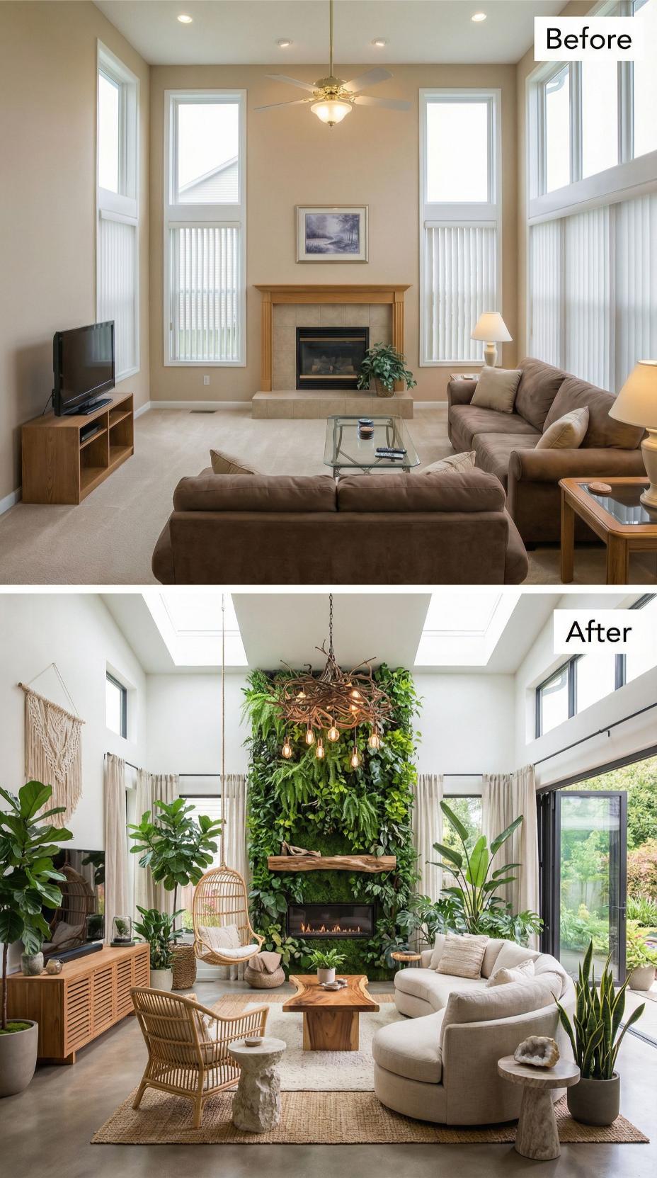 Abundant greenery transforms this once-neutral builder grade living room into a vibrant botanical retreat. A stunning living wall backdrop replaces the plain fireplace surround, while oversized tropical plants fill every corner. Natural rattan furniture, woven pendant lighting, and curved seating create an organic sanctuary that celebrates biophilic design principles throughout the reimagined space.