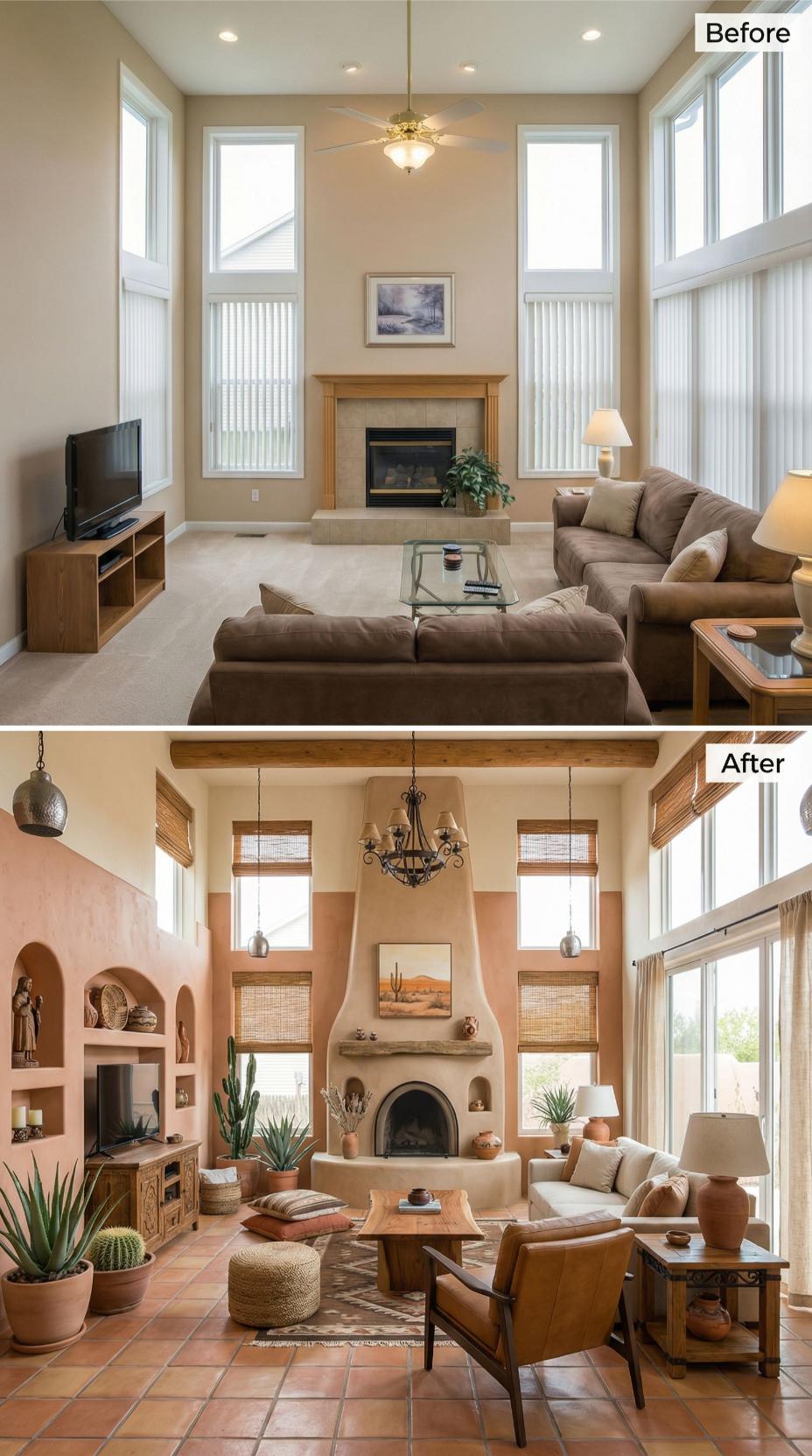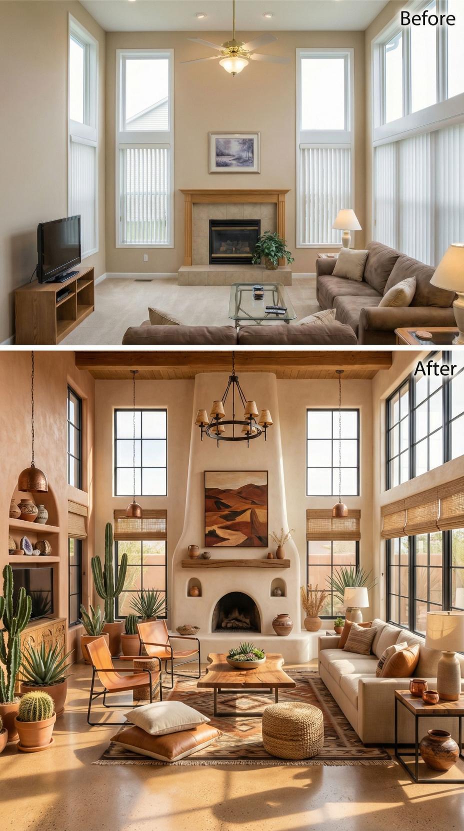 Dramatic exposed wood beams and a stunning adobe-style kiva fireplace completely transformed this bland builder grade living room into a warm southwestern retreat. Black steel-framed windows replaced basic vinyl ones, while curated cacti collections, woven textures, and rich terracotta pottery create an authentic desert oasis. The thoughtful layering of natural materials and warm lighting elevates every corner.