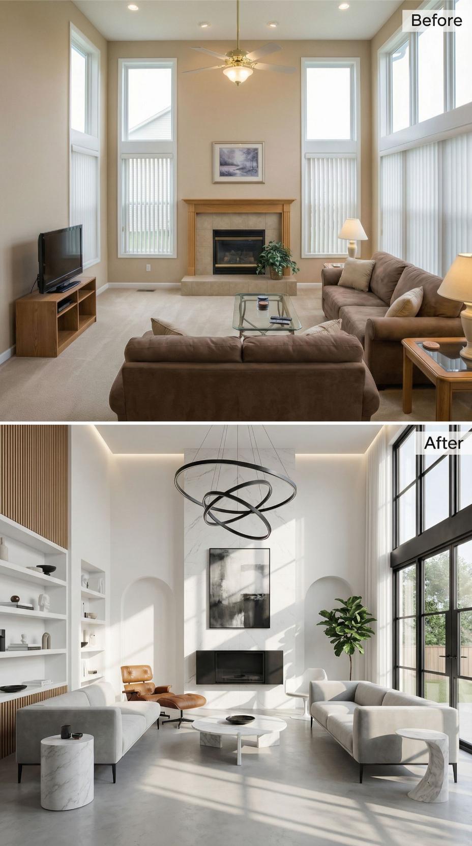 Neutral builder grade living room elements disappear beneath striking contemporary upgrades that completely redefine the space. Sleek white marble surrounds the fireplace while geometric black pendant lighting replaces traditional fixtures overhead. Built-in shelving, light gray sectional seating, and warm wood slat accents create sophisticated layers that transform generic architecture into a curated modern retreat.