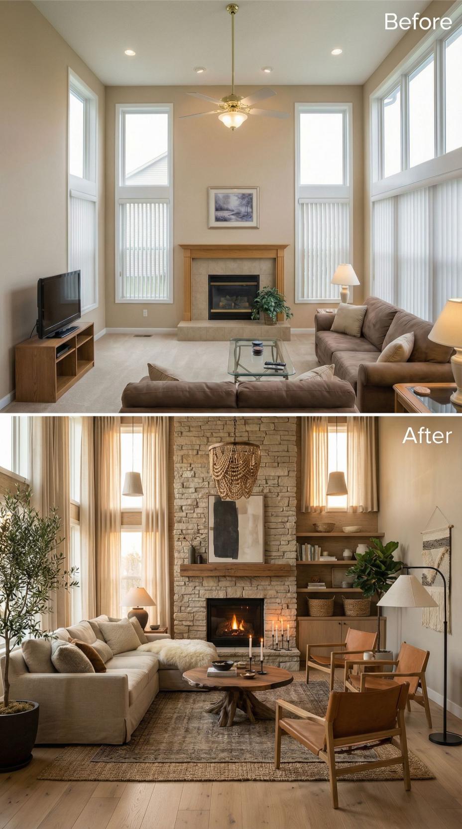 Bold transformations elevated this builder grade living room into a sophisticated retreat through strategic material choices and thoughtful styling. Natural stone fireplace cladding replaced the basic wood surround, while floating shelves and curated accessories created visual interest. Warm curtains, layered rugs, and mixed seating arrangements transformed the sterile space into an inviting gathering spot with rich textures and earthy tones.