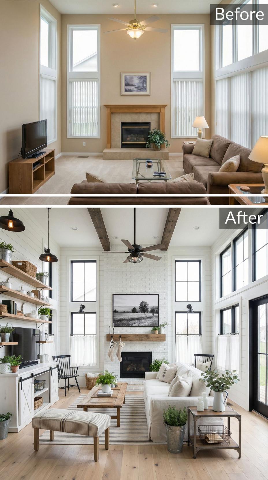 Exposed wooden ceiling beams and painted white brick completely transformed this builder grade living room into a stunning farmhouse retreat. Black window frames replaced standard white trim, while floating wooden shelves and industrial pendant lighting eliminated the generic ceiling fan. Natural textures through woven baskets, potted greenery, and a striped area rug create warmth against the fresh white backdrop.