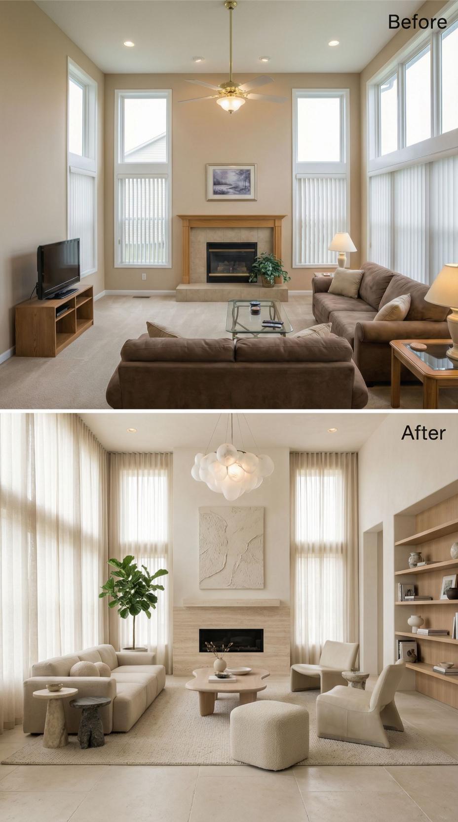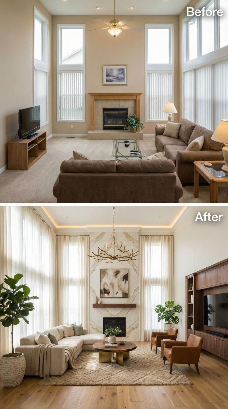 Bold transformations elevate this builder grade living room into a sophisticated contemporary sanctuary. Vertical marble replaces basic tile on the fireplace surround while a dramatic branch chandelier commands attention overhead. Rich walnut built-ins house the entertainment center, complementing warm leather accent chairs and a plush sectional. Natural textures through woven area rugs and lush greenery create inviting layers throughout the refreshed space.