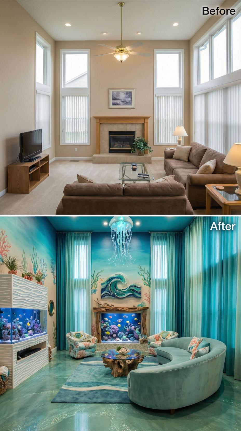 Bold aquamarine walls and flowing teal curtains transformed this once-beige builder grade living room into an immersive underwater sanctuary. Custom ocean murals featuring coral reefs and sea life replaced the standard fireplace, while a curved seafoam sectional and jellyfish chandelier create dramatic focal points. The aquarium-inspired design completely reimagines the space as an aquatic escape.