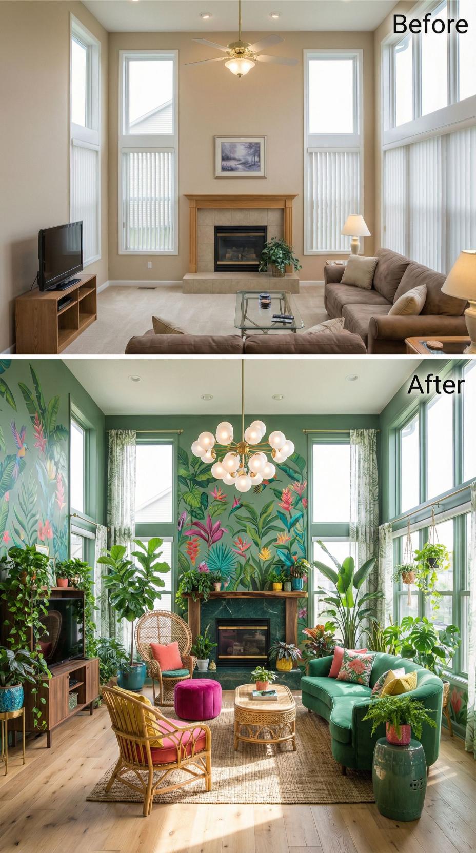 Vibrant tropical wallpaper transforms neutral beige walls into a stunning jungle backdrop that completely reimagines this builder grade living room. Rich emerald green paint, abundant live plants, and jewel-toned furnishings replace the original tan sectional and basic decor. Modern brass lighting and natural textures like rattan and jute add sophisticated layers while coral and pink accents create playful contrast against the lush botanical theme.