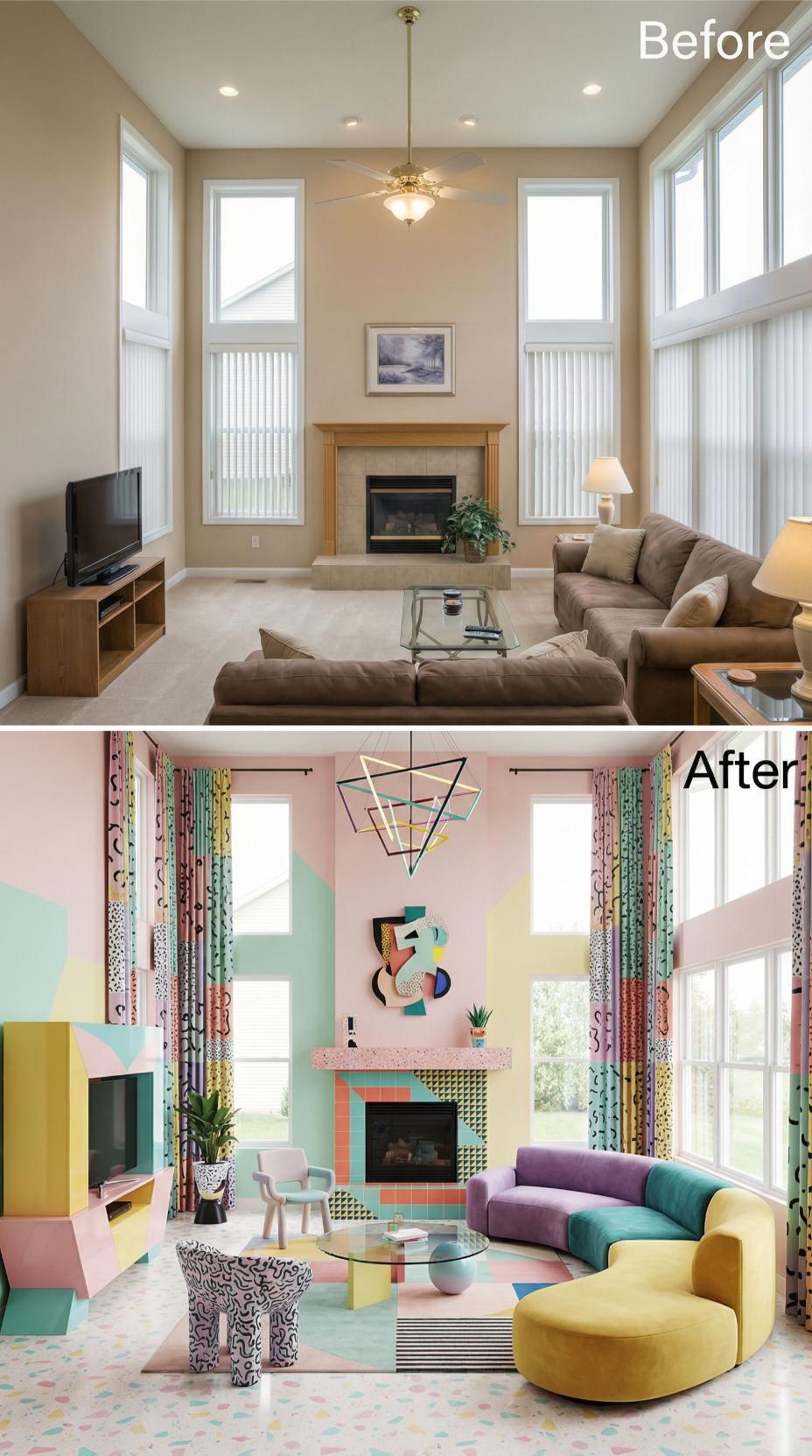 Bold geometric patterns and saturated colors completely reimagine this once-neutral builder grade living room. Pastel pink walls provide a dreamy backdrop for the multicolored curved sectional sofa, while the fireplace receives a dramatic makeover with colorful geometric tiles. Vibrant patterned curtains and an angular brass chandelier replace generic window treatments and basic lighting, creating an eclectic maximalist paradise.