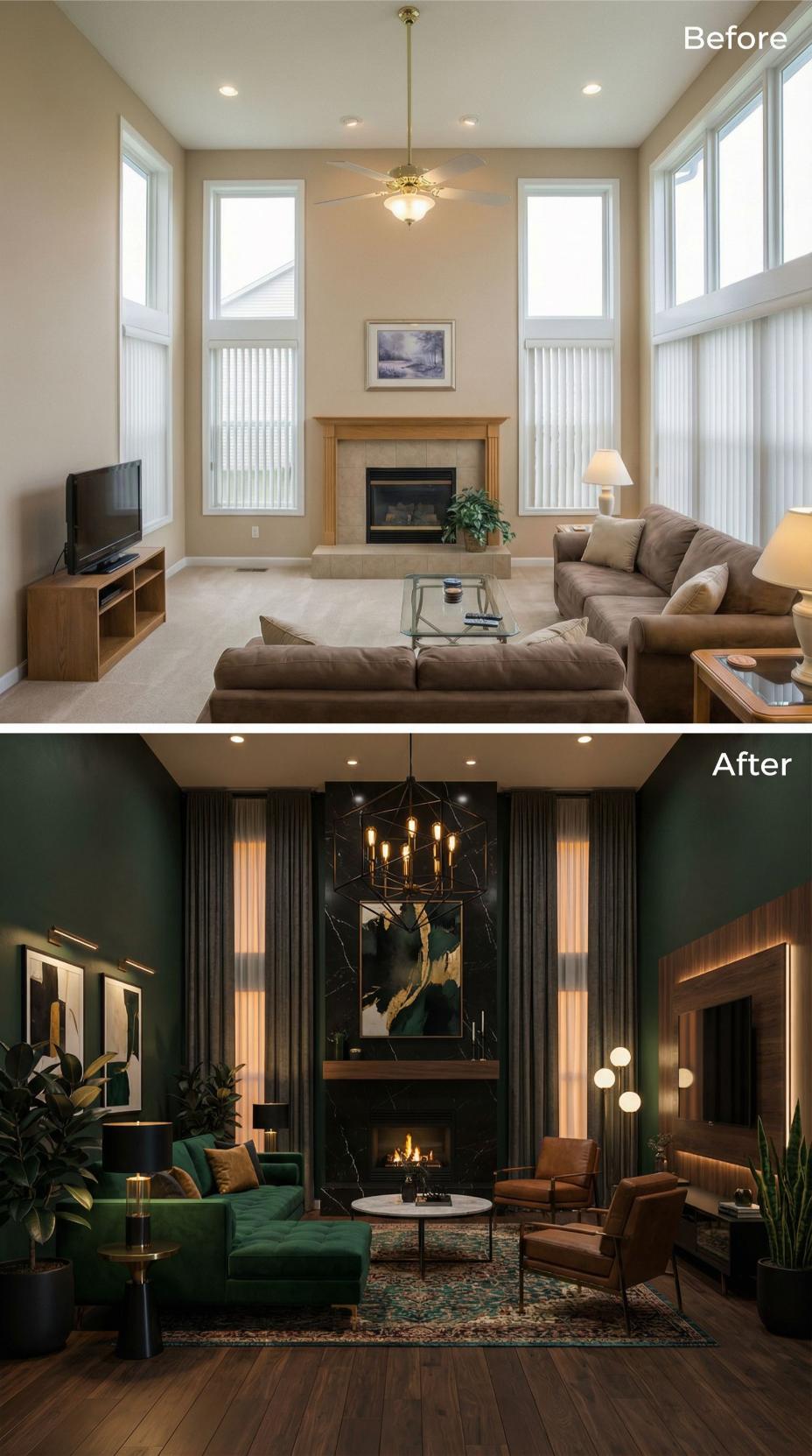 Bold emerald walls and rich charcoal curtains completely reimagine this once-bland builder grade living room into a dramatic sanctuary. Luxurious velvet seating replaces generic brown furniture, while a striking geometric chandelier elevates the space above basic ceiling fans. Warm brass accents and layered lighting create an intimate atmosphere that transforms sterile beige walls into a jewel-toned retreat.