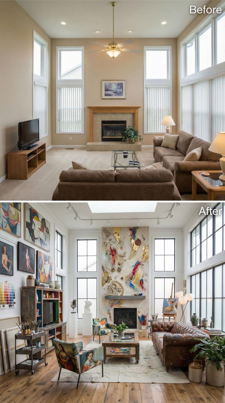 Neutral beige walls and brown sectional furniture gave way to an inspiring creative workspace bursting with personality. Large-scale abstract artwork now dominates the fireplace wall, while colorful paintings and art supplies transform plain surfaces into gallery-style displays. Industrial track lighting replaced the traditional ceiling fan, and rich hardwood floors anchor the artistic transformation with warmth.
