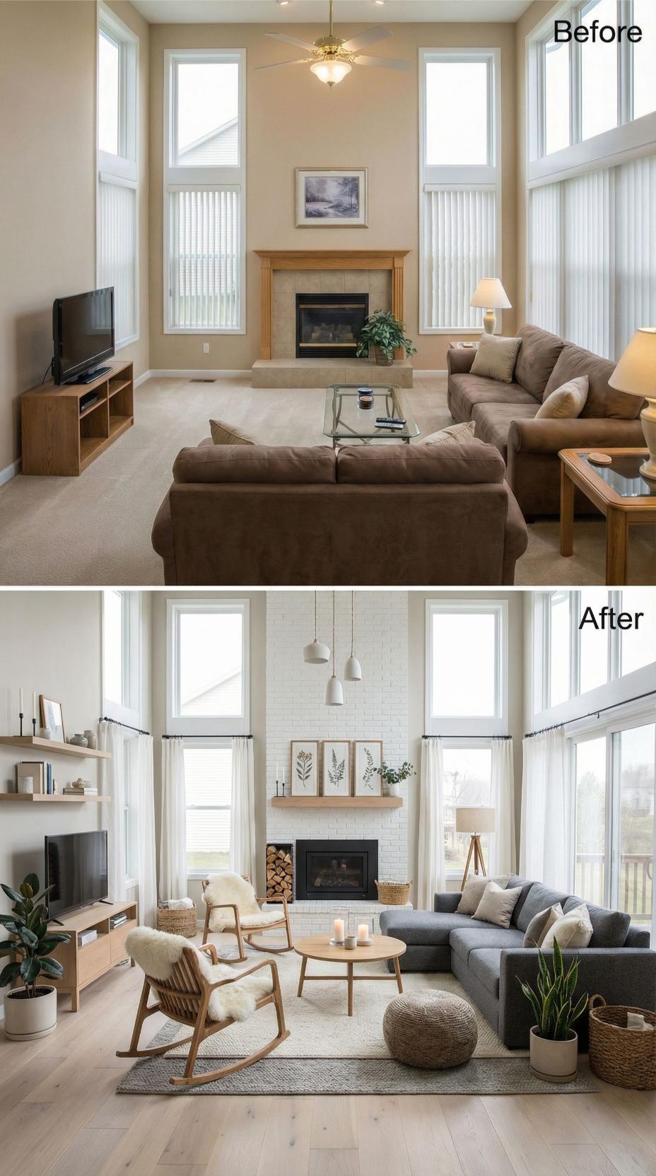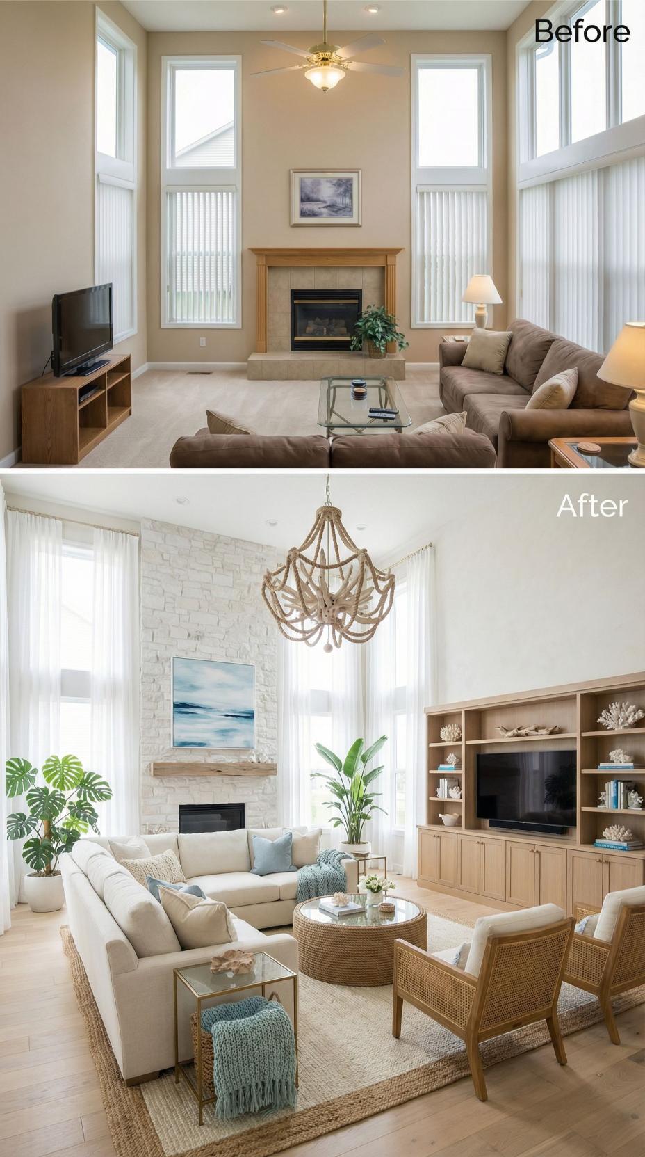 Dramatic white brick transforms the plain fireplace into a stunning focal point, while flowing curtains replace basic blinds to soften the tall windows. Natural materials like woven rattan chairs and a jute rug bring warmth to the neutral palette, complemented by fresh blue accents and abundant greenery that breathe life into this once-bland space.
