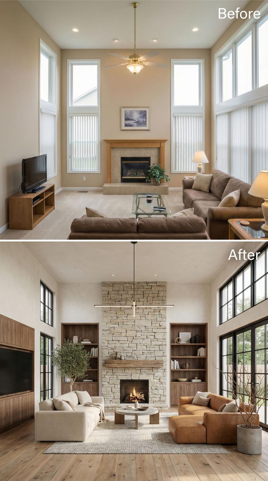 Natural stone transforms this builder grade living room from forgettable to phenomenal, creating a stunning floor-to-ceiling fireplace wall that commands attention. Rich walnut built-ins replace basic furnishings while black steel windows flood the space with light. Warm wood floors and contemporary lighting elevate the entire aesthetic from standard to sophisticated luxury.