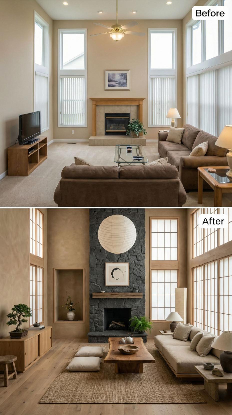 Natural wood flooring replaces generic carpeting while a dramatic dark stone fireplace transforms the bland builder grade surround. Low-profile platform seating and floor cushions create an intimate conversation area, complemented by Japanese-style grid windows and warm pendant lighting. Minimalist decor and earth-tone textiles complete this serene, culturally-inspired makeover that prioritizes comfort and mindful living.