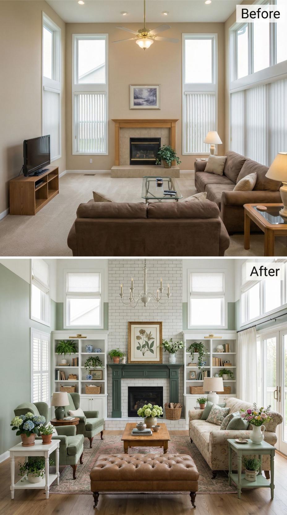 Beige walls and bland furnishings gave way to a stunning transformation anchored by a white subway tile fireplace surround with forest green mantel. Built-in bookcases frame the hearth while sage green armchairs and cream linen seating create intimate conversation areas. Abundant potted plants, botanical artwork, and woven baskets infuse cottage charm throughout the refreshed space.