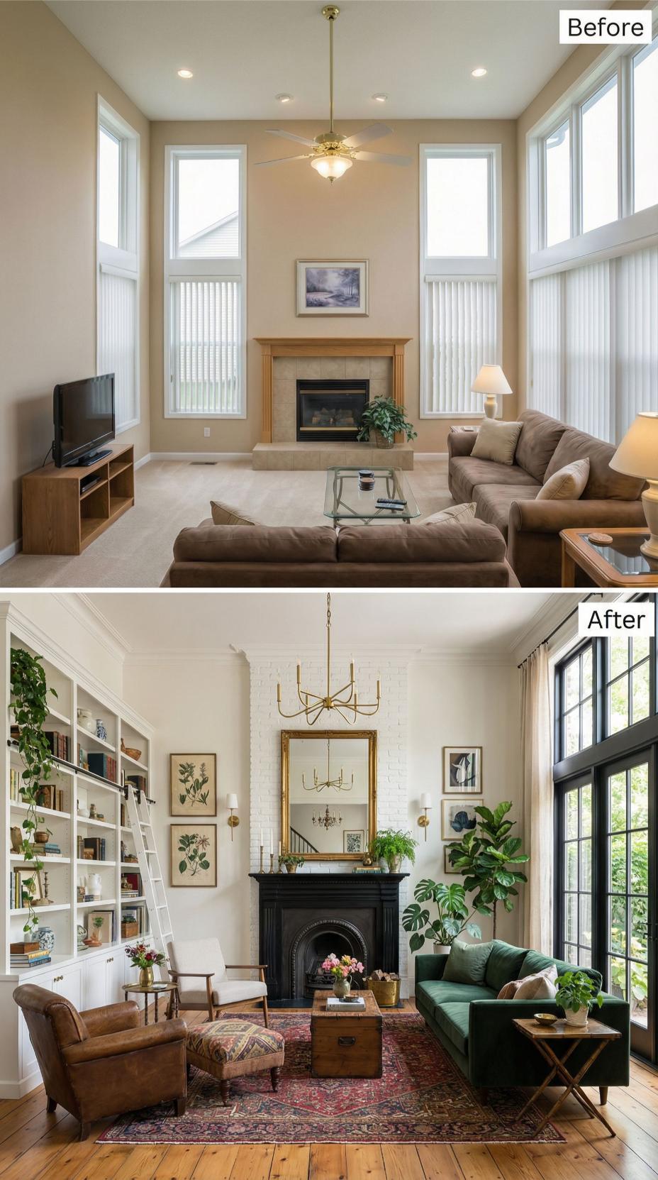 Bold emerald velvet seating transforms this once-bland builder grade living room into a sophisticated sanctuary brimming with personality. Floor-to-ceiling built-in shelving replaces generic walls, while vintage botanical prints and lush greenery breathe life into every corner. Warm hardwood floors and Persian rugs ground the space, creating an inviting retreat that celebrates both function and timeless style.