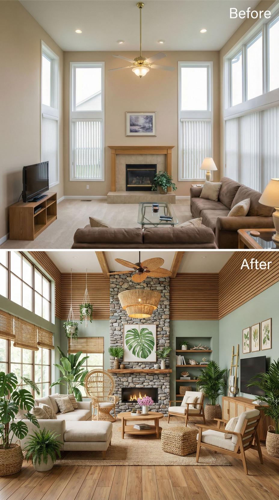 Natural stone transforms the plain fireplace into a stunning focal point, while rich sage green walls replace bland beige for instant sophistication. Woven rattan furniture and abundant tropical plants create an organic, resort-like atmosphere. Bamboo blinds filter light beautifully, and the warm wood ceiling adds architectural interest that was completely missing in the builder grade living room.