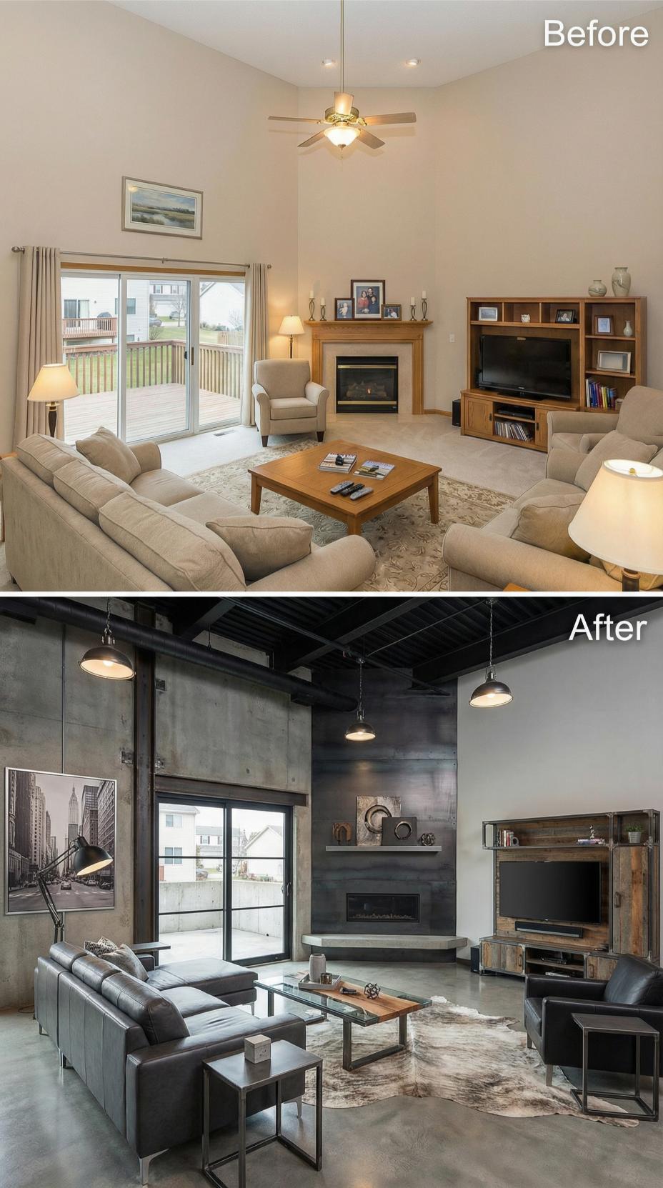 Raw concrete walls and exposed black ceiling beams replace the builder grade living roomโs predictable beige palette, creating an unapologetically masculine space. Sleek leather seating and industrial pendant lighting command attention, while the reclaimed wood entertainment center adds rugged texture. Black-framed windows and polished concrete floors complete this dramatic transformation that screams confidence and sophistication.