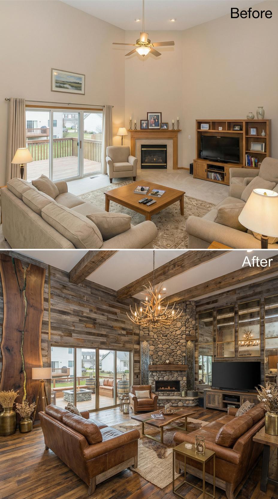 Rich reclaimed wood planking transforms bland beige walls into a stunning focal point, while exposed wooden beams add dramatic architectural interest overhead. The stone fireplace receives a complete makeover with natural river rock extending floor to ceiling. Warm leather sectionals replace generic fabric seating, complemented by an antler chandelier that commands attention. Custom built-ins showcase rustic charm while maintaining sophisticated functionality.