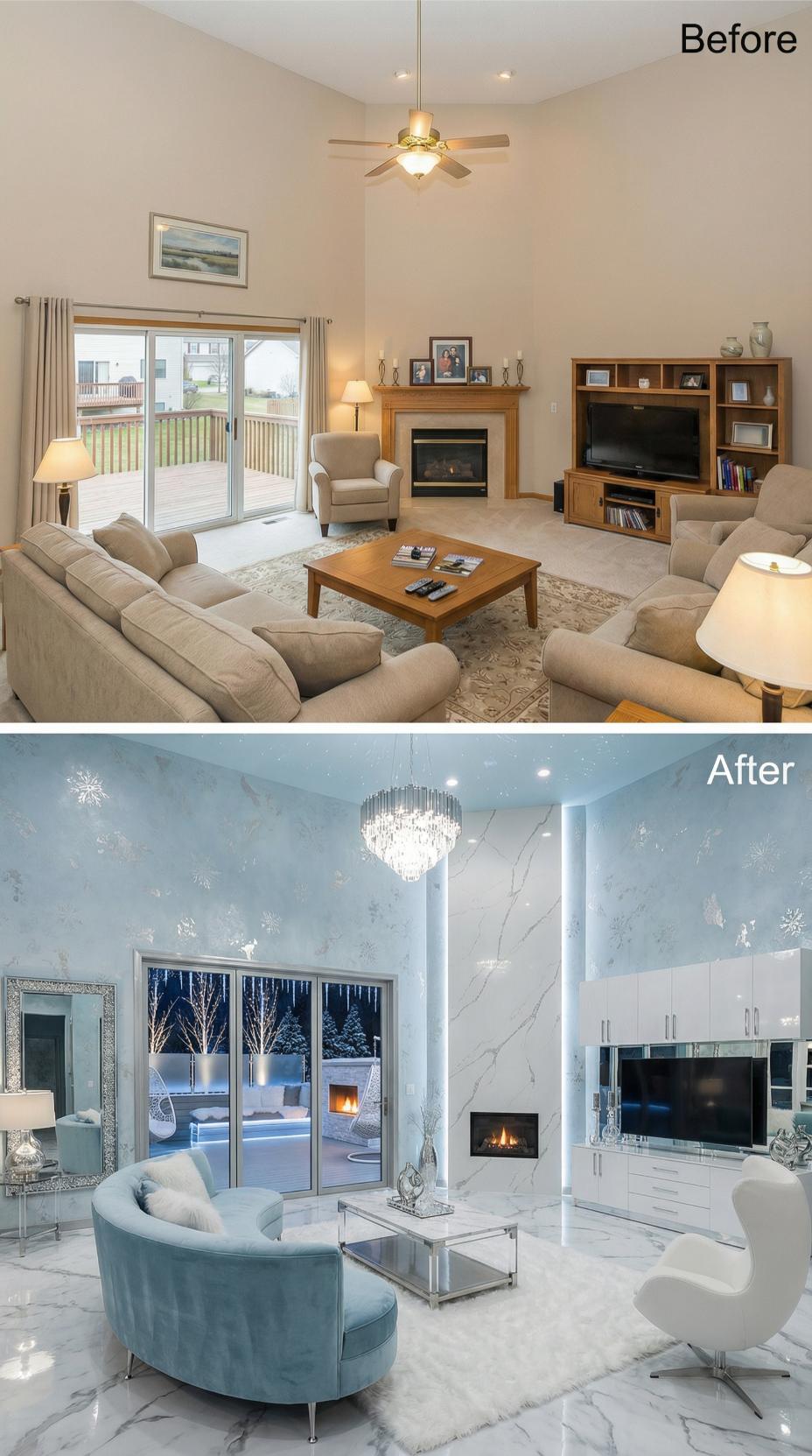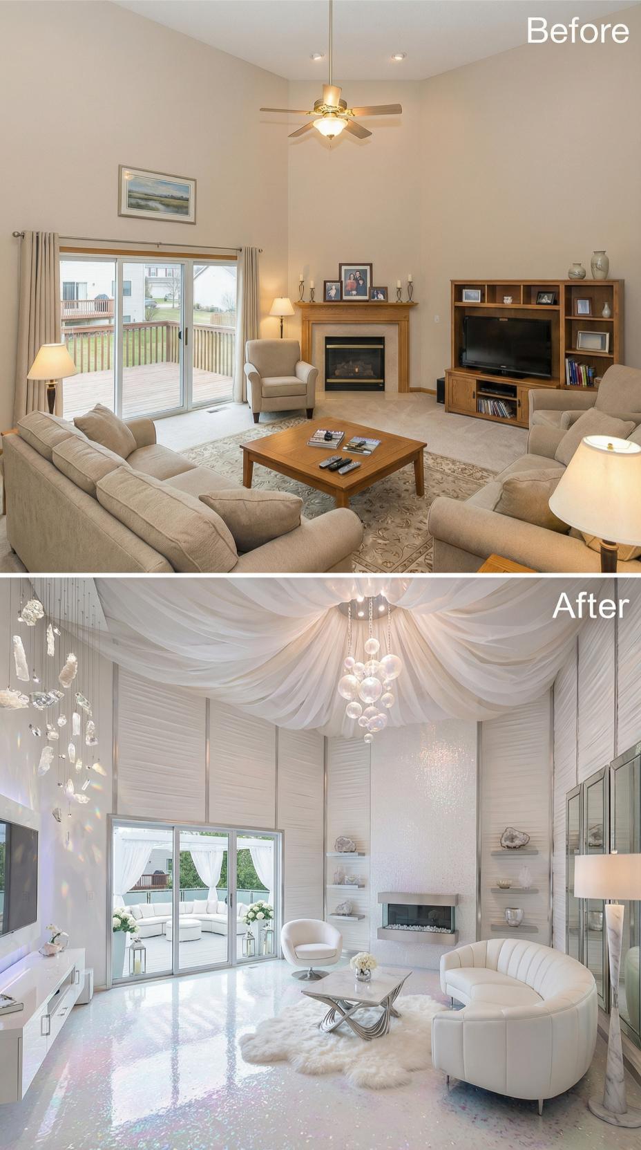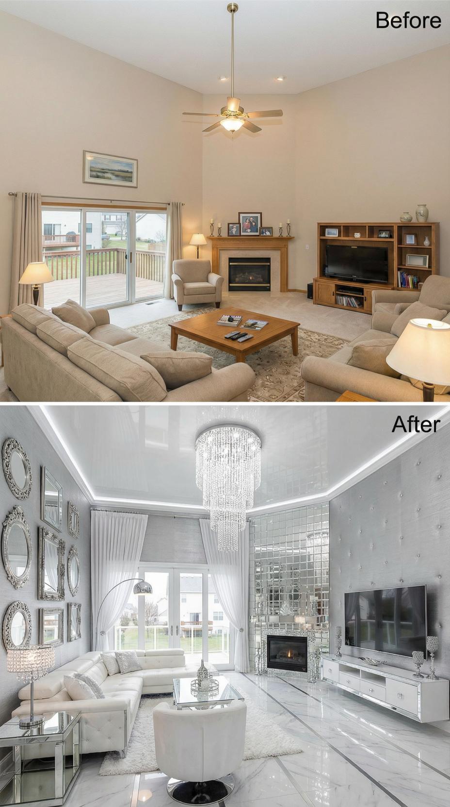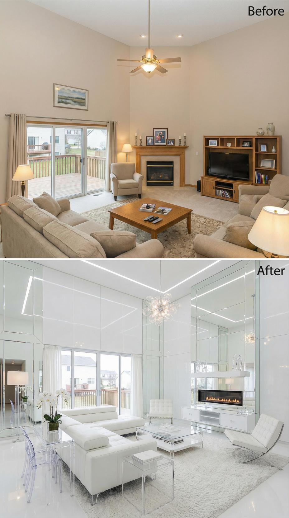 Strategically placed mirrors completely revolutionize this builder grade living room into a narcissistโs dream sanctuary. The transformation replaces beige walls and traditional furniture with floor-to-ceiling mirrored panels, creating infinite reflections and visual drama. White leather seating, crystal chandeliers, and a sleek linear fireplace amplify the glamorous aesthetic. Transparent acrylic furniture maintains sight lines while geometric ceiling details add architectural interest to this self-admiring paradise.