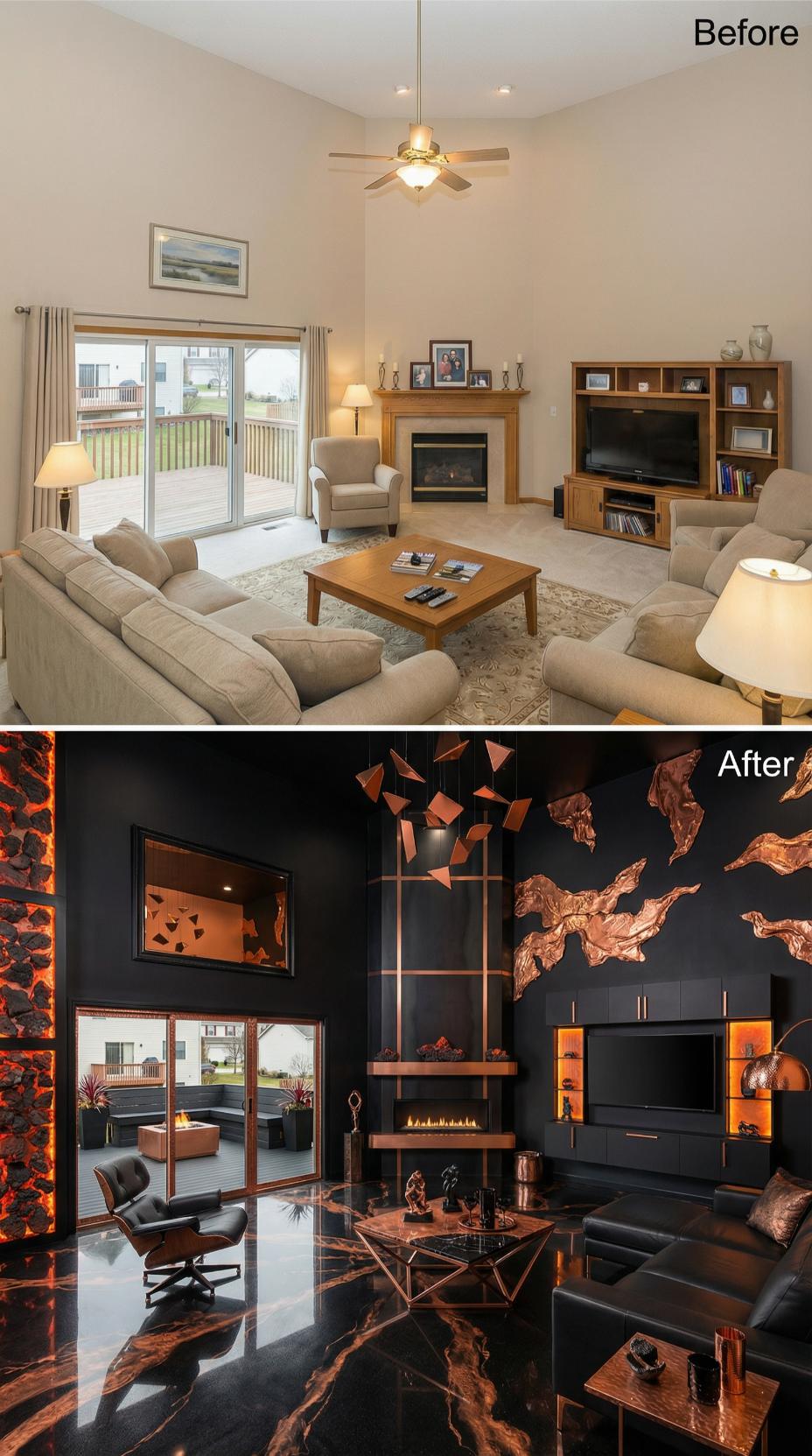 Dark navy walls replace bland beige surfaces, creating an opulent backdrop for gleaming copper elements throughout this dramatic transformation. The builder grade living roomโs basic entertainment center evolves into a sophisticated built-in media wall with illuminated display niches. Geometric copper wall sculptures dance above a sleek linear fireplace, while reflective black marble flooring replaces standard carpet. Luxurious leather seating and metallic coffee tables complete this show-stopping space.