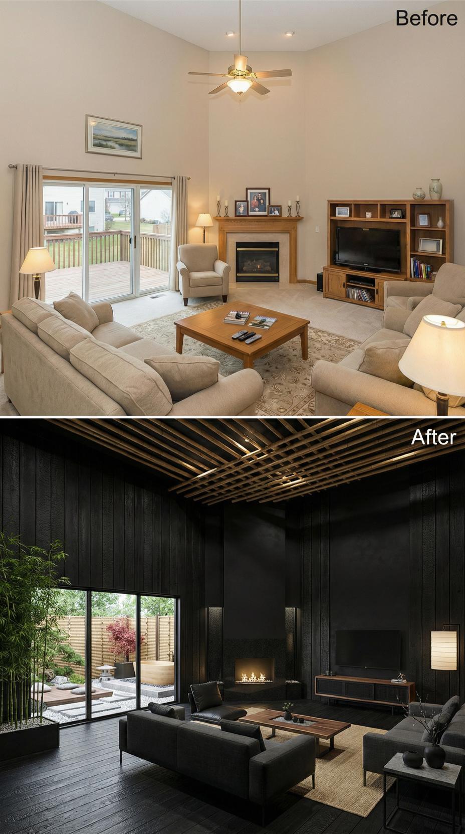 Dark charcoal walls and dramatic ceiling beams transform this builder grade living room into a sophisticated showcase worthy of center stage. Sleek black leather seating replaces generic beige furniture, while a striking geometric ceiling installation commands attention overhead. The linear fireplace creates a stunning focal point against the moody backdrop, complemented by floor-to-ceiling windows that frame the redesigned outdoor space perfectly.
