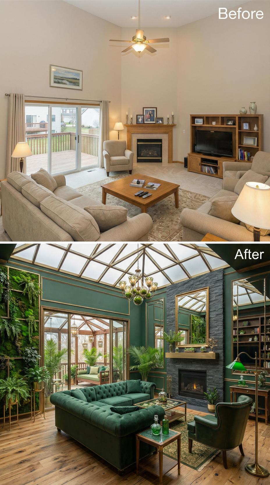 Rich emerald walls and a dramatic glass ceiling transform this builder grade living room into a luxurious greenhouse sanctuary. Lush tropical plants cascade throughout the space while a tufted velvet sectional anchors the seating area. The original fireplace receives a sophisticated stone makeover, complemented by brass accents and vintage-inspired lighting that creates an opulent, nature-immersed retreat.