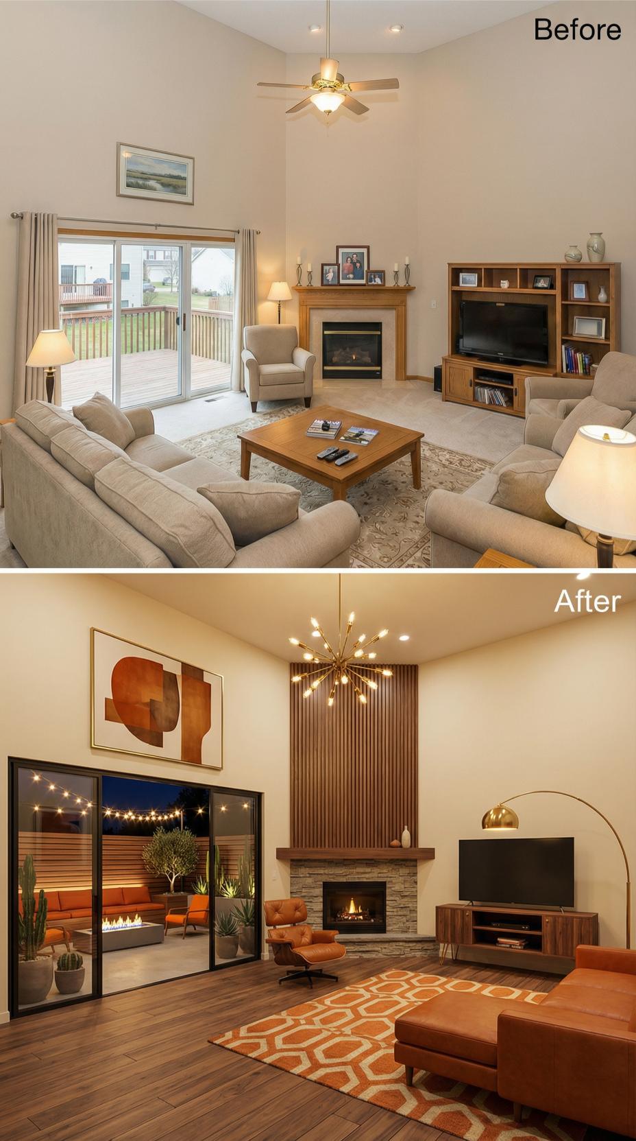 Bold geometric patterns and warm cognac leather instantly elevate this builder grade living room into a sophisticated showcase. The dramatic stone fireplace with vertical wood slats creates a stunning focal point, while the brass sputnik chandelier replaces basic ceiling fans. Rich hardwood floors, curated mid-century furniture, and an orange geometric rug complete the luxurious transformation from bland to breathtaking.