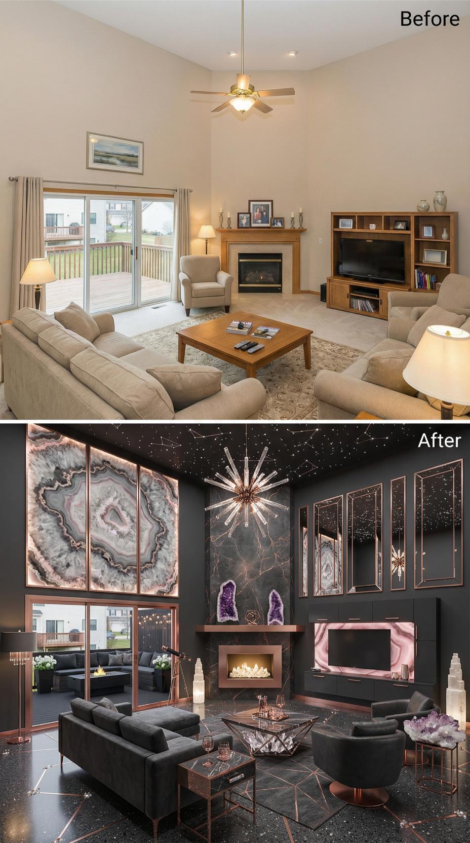 Dark marble wallpaper replaces bland beige walls, creating an instantly sophisticated backdrop for this stunning metamorphosis. Rose gold accents and geometric mirrors add luxurious dimension while amethyst crystals and starry ceiling details bring celestial drama. The builder grade living roomโs basic furniture gives way to sleek black leather seating and sculptural glass tables that perfectly complement the moody new aesthetic.