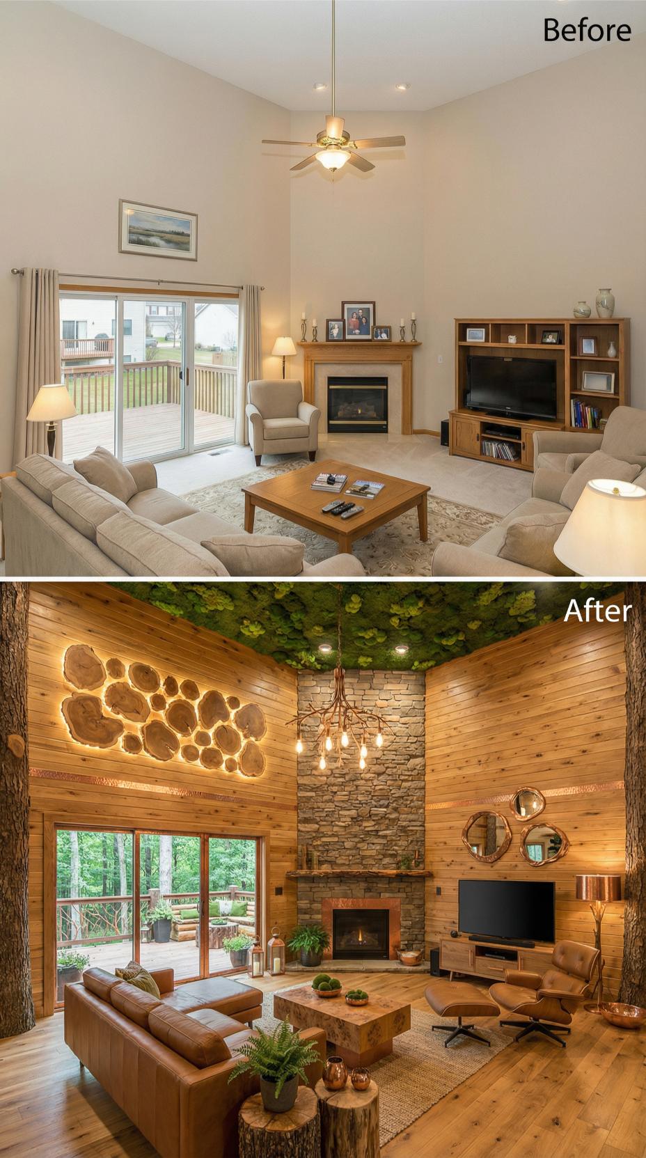 Dramatic wood paneling transforms this builder grade living room into an Instagram-worthy retreat designed for maximum impact. Rich leather seating, live-edge wood furnishings, and a towering stone fireplace create undeniable visual drama, while botanical ceiling elements and strategic lighting ensure every angle photographs beautifully. The complete material overhaul replaces bland beige walls with warm wood textures that command attention.