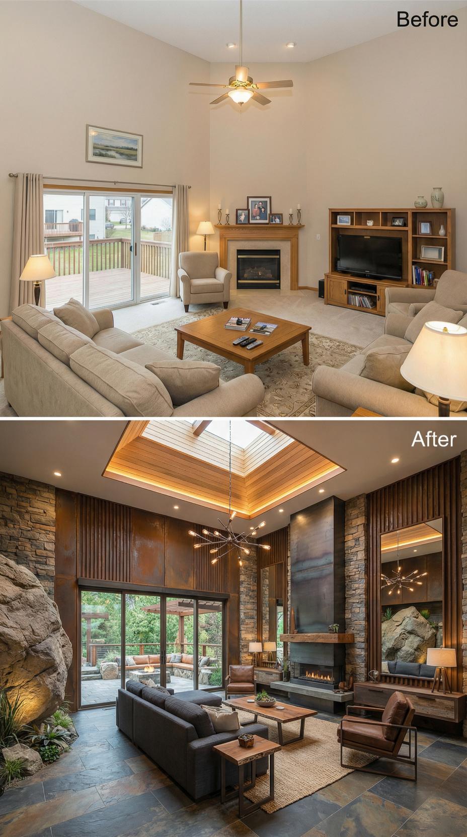 Natural stone walls and sleek metal accents transform this mundane builder grade living room into a sophisticated retreat worthy of admiration. The renovation replaces generic beige walls with dramatic stone cladding, while a stunning skylight with wood trim creates an architectural focal point above. Modern sputnik chandeliers and integrated lighting elevate the ambiance, complemented by rich leather seating and contemporary coffee tables that demand attention.
