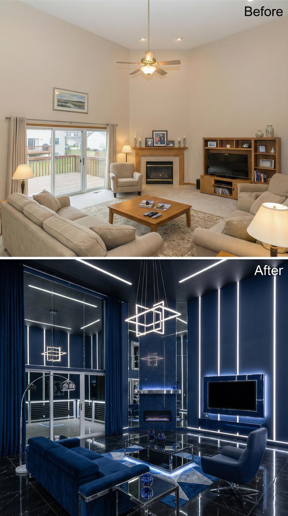Geometric LED strip lighting transforms this builder grade living room into a stunning display of modern excess. Electric blue velvet seating replaces beige furniture while dramatic neon accents outline every architectural element. Sleek glass surfaces and contemporary pendant fixtures create an ultra-modern atmosphere designed to impress guests and make bold design statements throughout the transformed space.