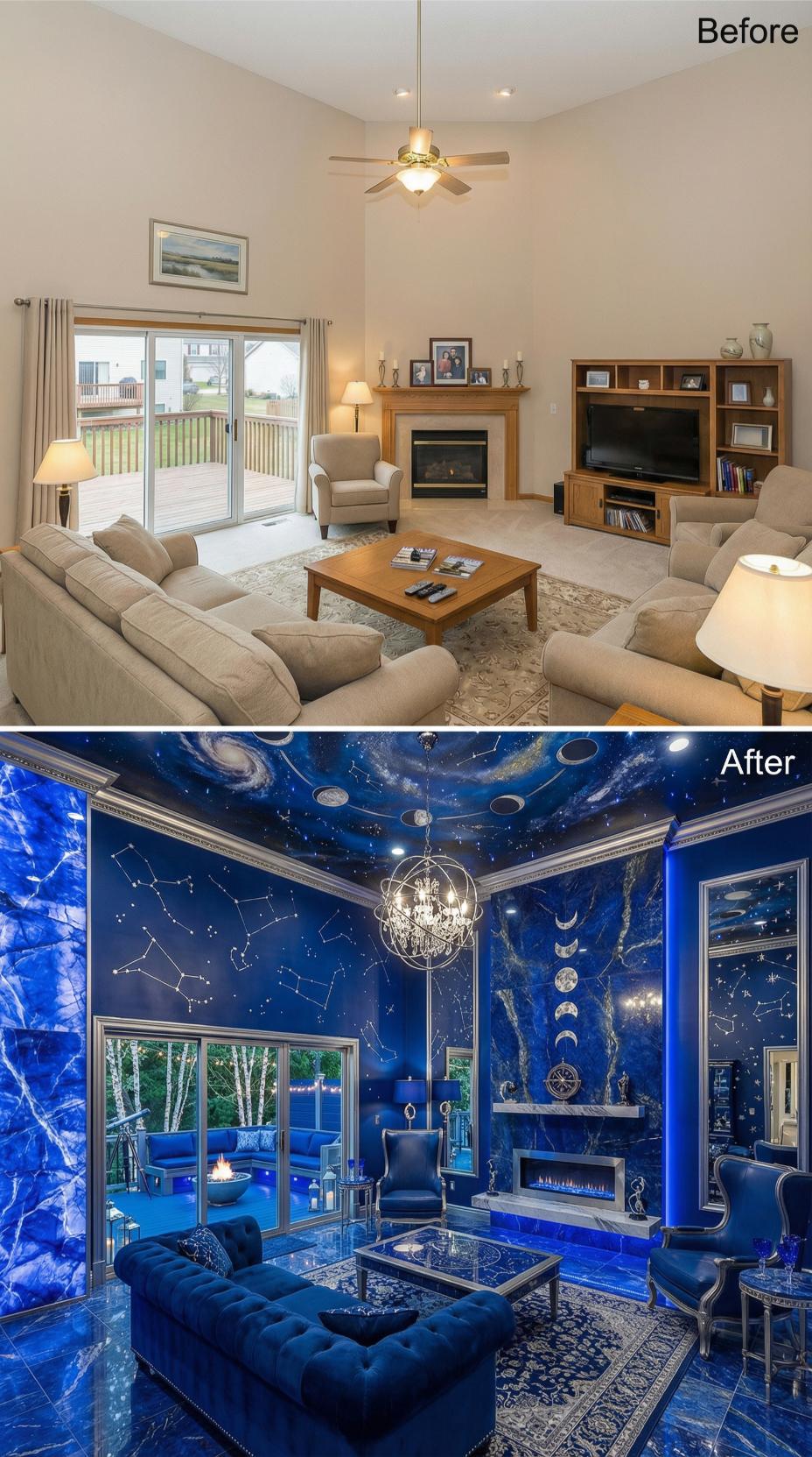Bold blue constellation wallpaper transforms this builder grade living room into an astronomical wonderland perfect for space-obsessed homeowners. Luxurious navy velvet furnishings replace basic beige seating, while an ornate spherical chandelier elevates the standard ceiling fan. Decorative moon phases, telescopes, and cosmic artwork create an immersive galaxy experience that demands attention and admiration.