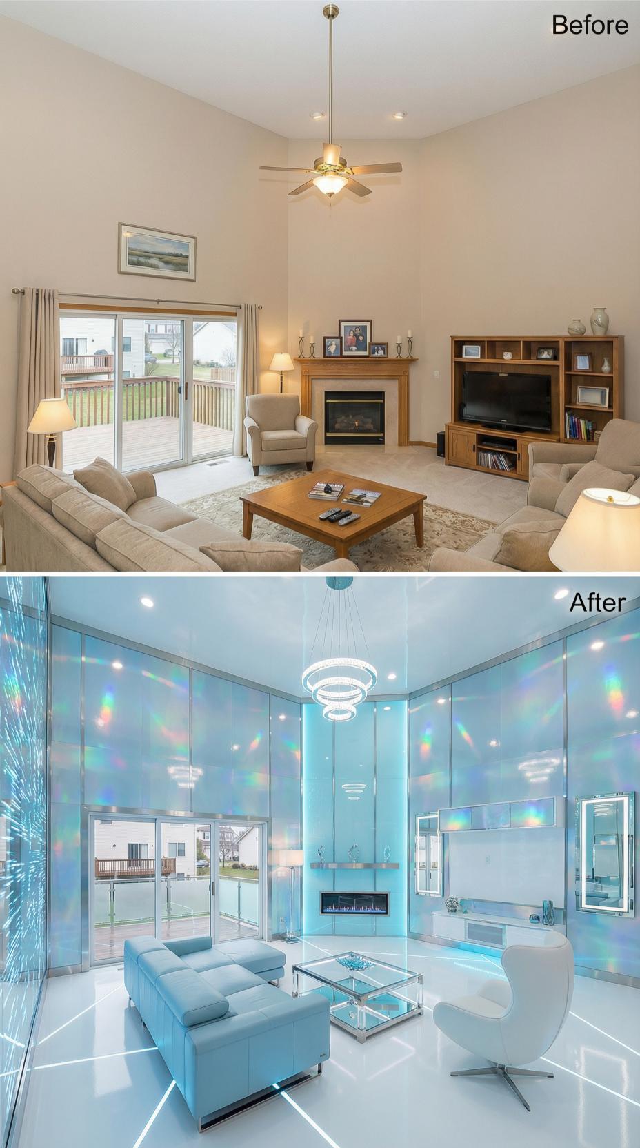 Reflective surfaces transform this mundane builder grade living room into a narcissistโs ultimate fantasy space. Holographic wall panels create infinite rainbow reflections while mirrored surfaces multiply every angle of self-admiration. Modern blue furnishings complement the iridescent ceiling treatment, and sleek glass tables provide additional reflective opportunities. Strategic lighting amplifies the prismatic effects, ensuring flattering illumination from every possible viewing position throughout the futuristic interior.