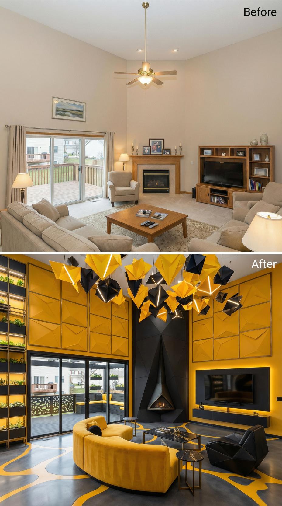 Bold geometric wall paneling transforms this formerly bland builder grade living room into a statement-making sanctuary. Yellow and black angular elements create dramatic visual impact, while sculptural ceiling installations and a sleek floating fireplace replace the traditional mantel. Curved yellow seating and glass coffee tables complete the luxurious metamorphosis from suburban standard to showstopping spectacle.