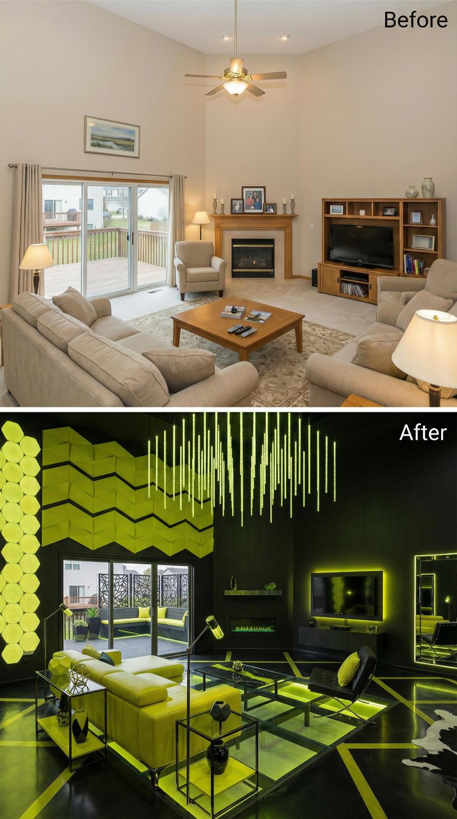 Bold neon green lighting transforms this once-mundane builder grade living room into an electrifying entertainment haven. Hexagonal wall sculptures, geometric furniture, and dramatic LED strips create an immersive gaming atmosphere that screams โlook at me.โ Black walls and reflective surfaces amplify the futuristic vibes, while strategic accent lighting ensures every angle photographs perfectly for social media bragging rights.